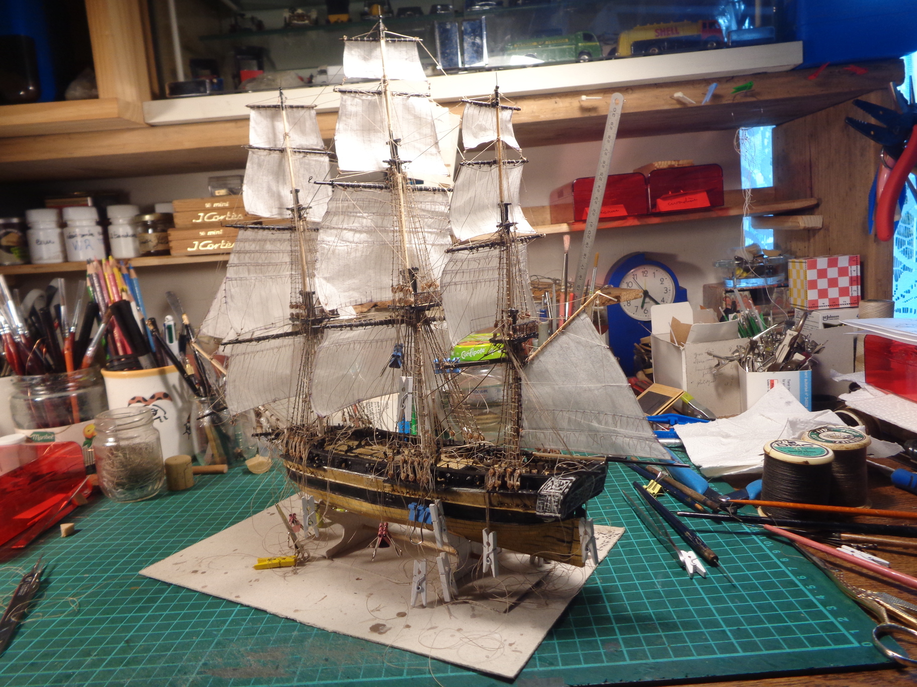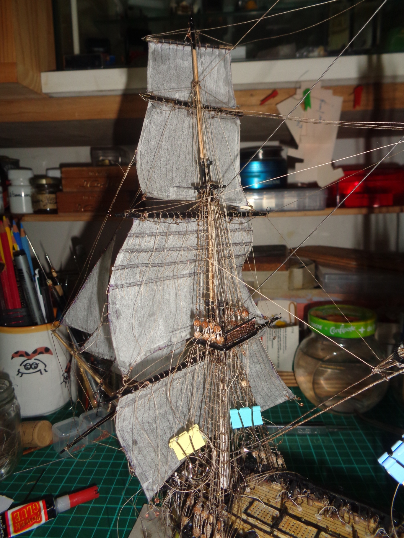 J'ai posé toutes les voiles, je suis en train de finir le câblage de la voile de perroquet de fougue (la dernière). Il restera sa vergue à mettre avec un certain mal au vu de l'encombrement du mât, et je commencerai le rangement des cordages avant de compléter le remplissage du pont, puis la pose des cordages "extérieurs" .