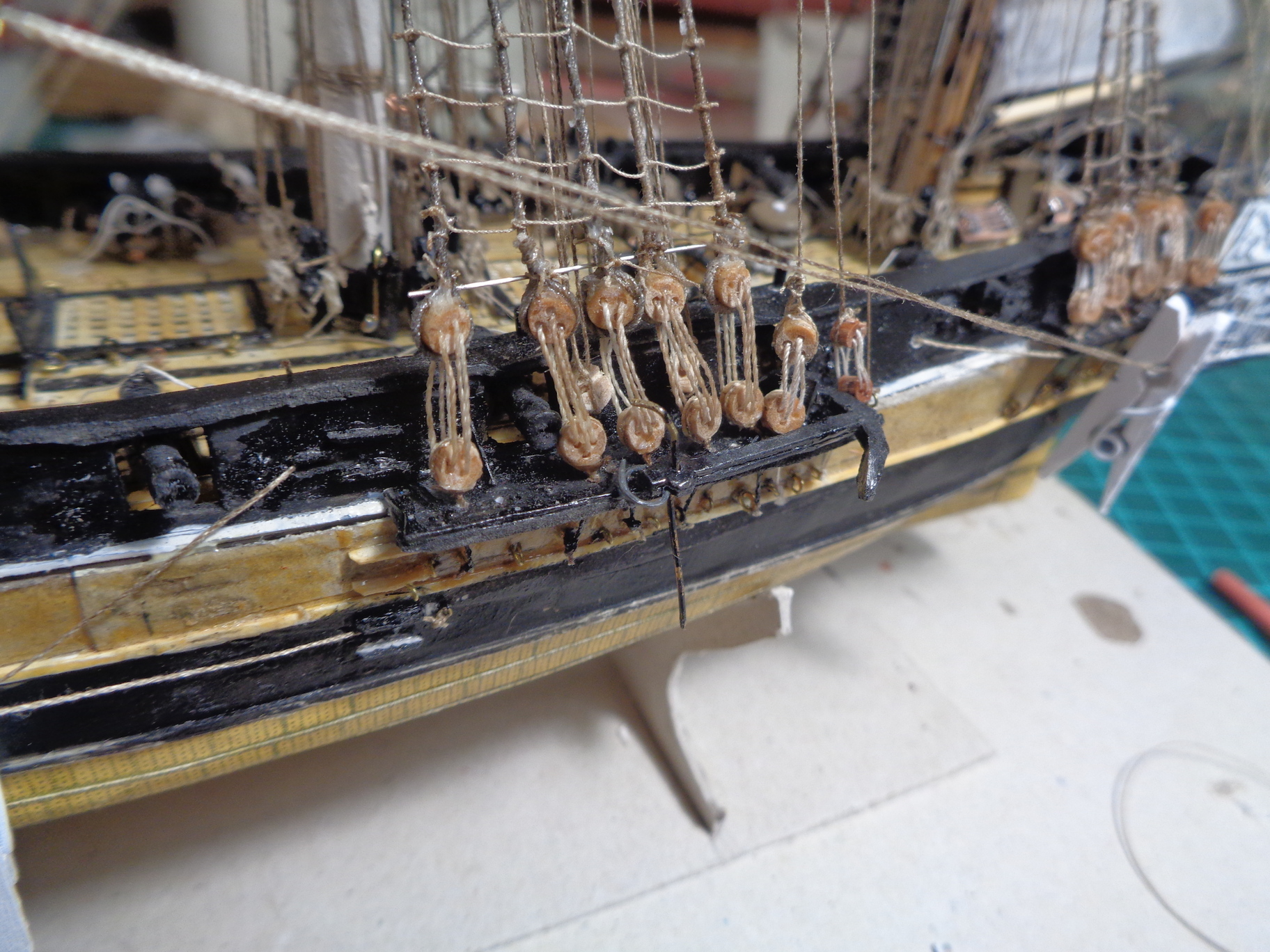 Me voici dans la dernière ligne droite. Il ne me reste plus qu'à poser les câbles des ancres (que je viens de faire), fixer les embarcations et coller les mantelets. Mais voici la progression.