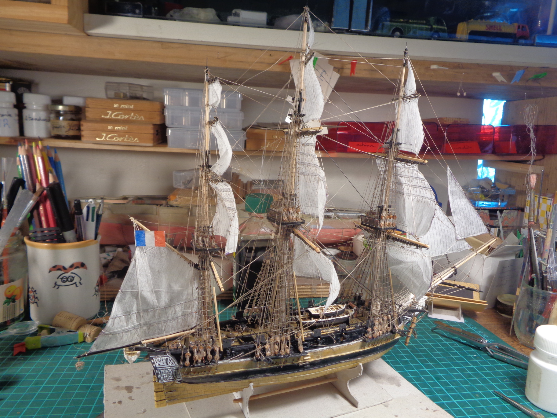 Quelques images de la corvette finie. Il y en aura d'autres avec les planches, quand j'aurai fait la vitrine. Je rappelle que je n'ai inventé aucun cordage, j'en ai même plutôt passé quelques uns sous silence. Avec les voiles d'étai et les bonnettes, compter environ 80 cordages de plus....