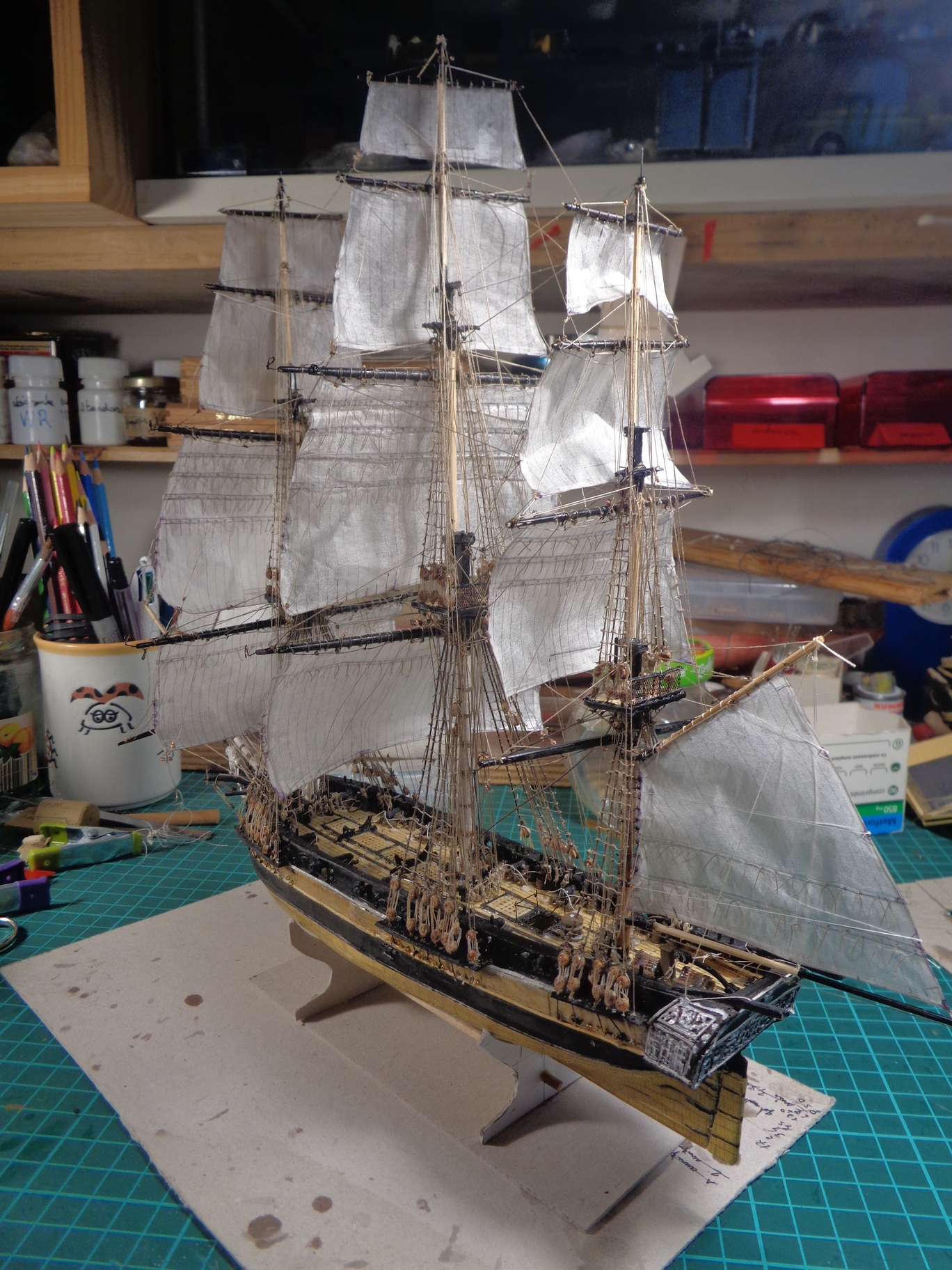 Voici le navire quasiment fini, avec son drapeau pas encore froissé, sa petite bouée (le détail qui tue) en bout de gui. Pensez que si j'avais mis les bonnettes et les voiles d'étai, je pouvais ajouter une centaine de cordages et deux cent poulies.... Le navire est trop petit! Les vergues un peu trop tournées sont commandées depuis la hune d'artimon. Les marins ne sont pas encore montés rectifier l'orientation.