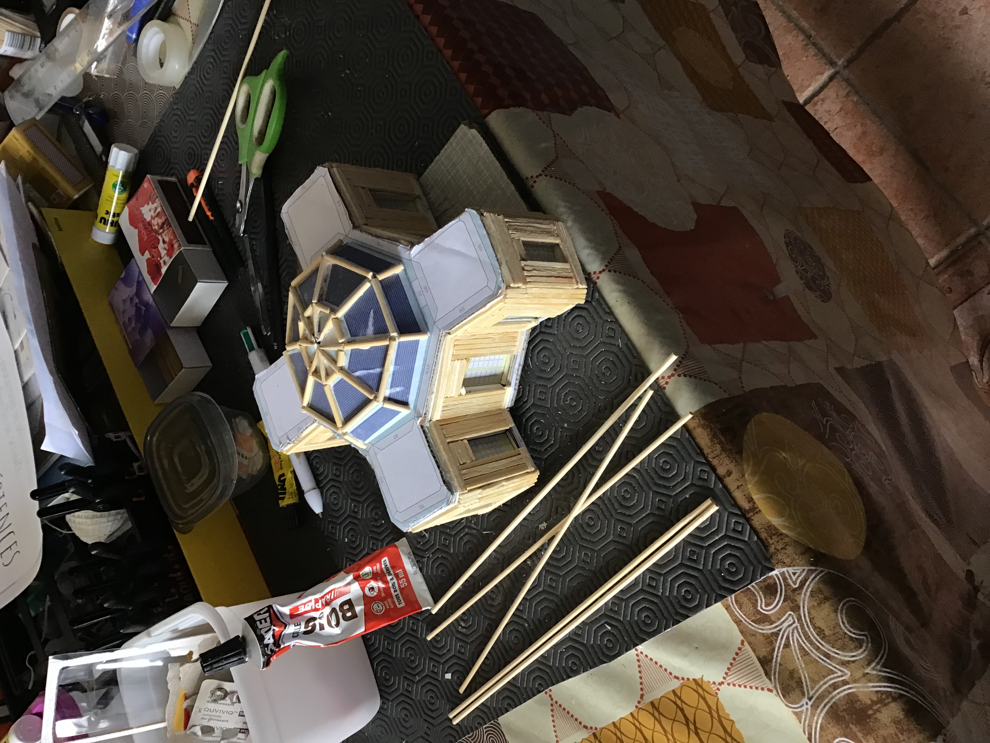 Début du toit du pavillon français,à base de bâtonnets de brochette en bois .