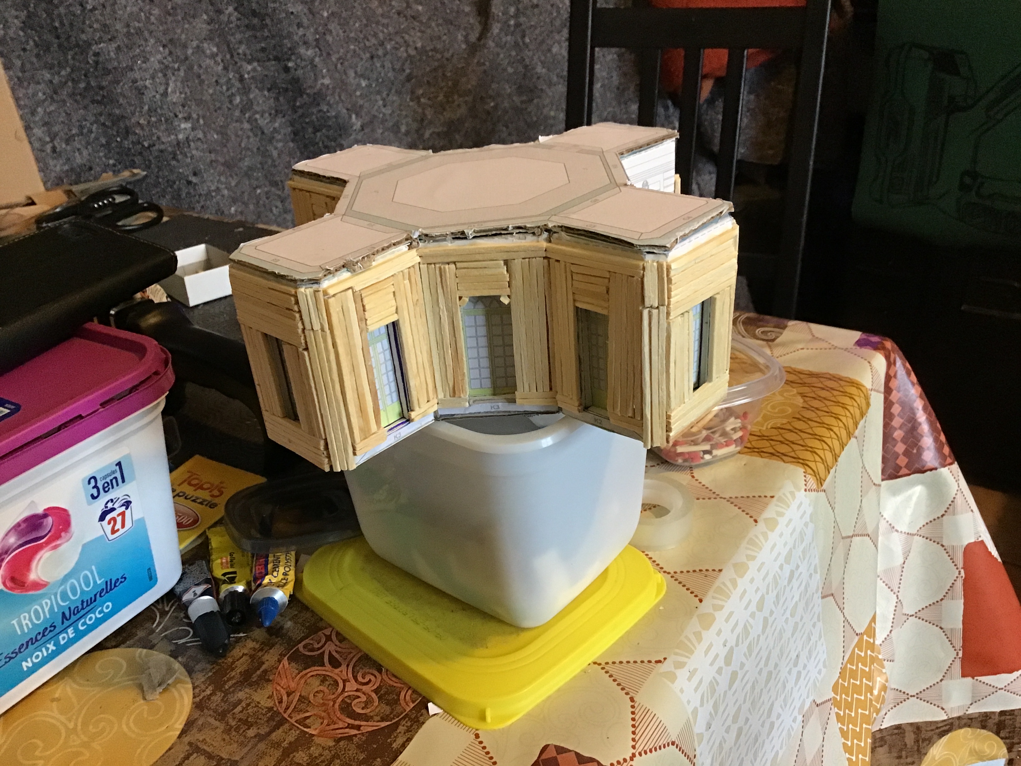 Progression du toit en bois de brochettes et en cure dent, la différence de diamètre des broches fait un beau résultat.