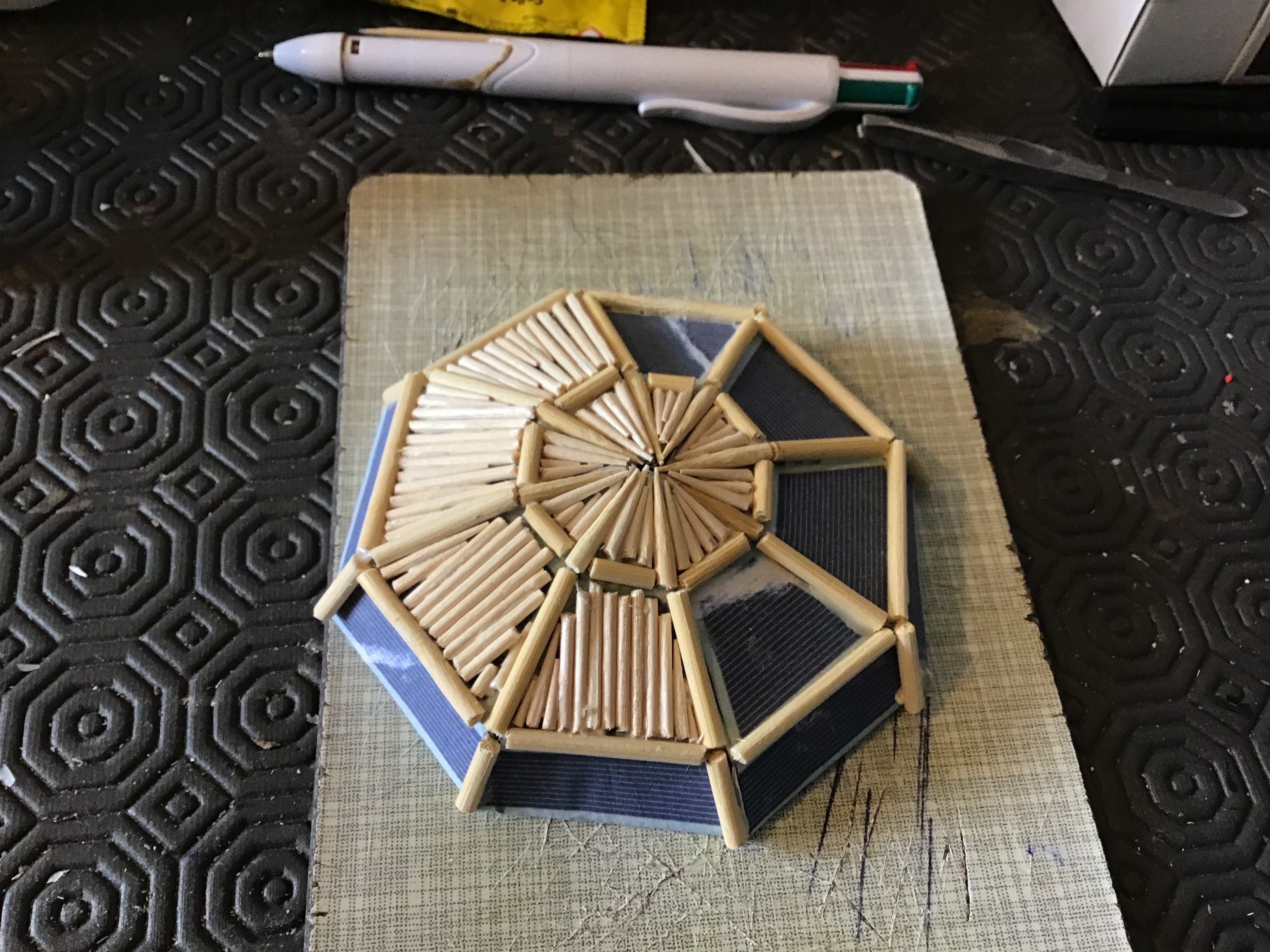 Début du toit du pavillon français,à base de bâtonnets de brochette en bois .