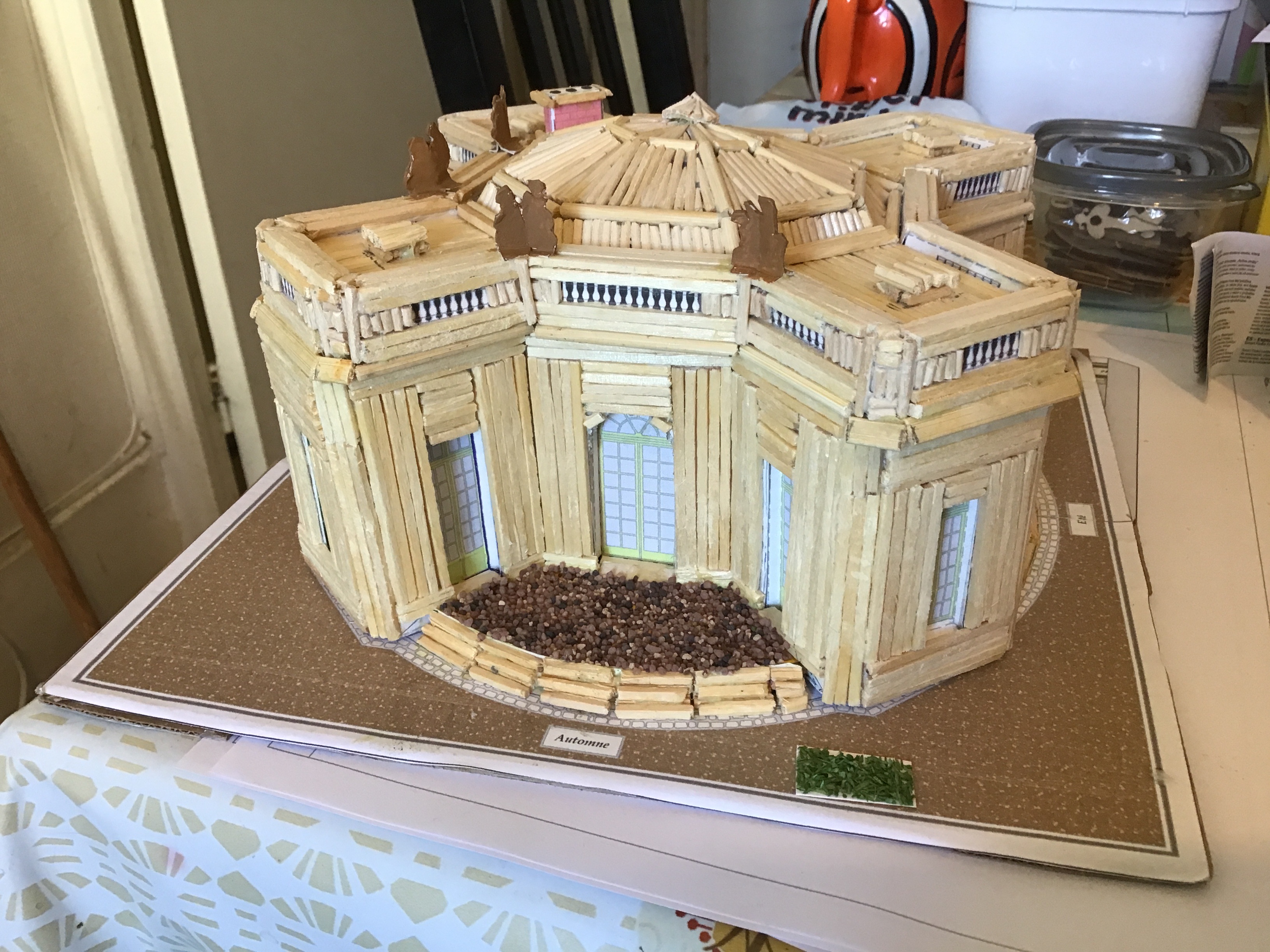 Début du toit du pavillon français,à base de bâtonnets de brochette en bois .