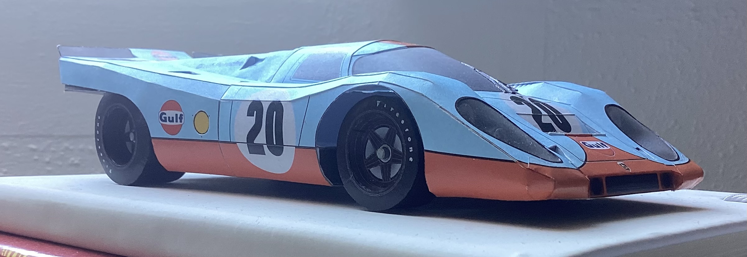 Porsche 917K de 1970, ech. 1/24. La livrée est celle de la voiture de Steve McQueen dans le film « Le Mans » (1971). La maquette provient de papersportscars.wz.cz.