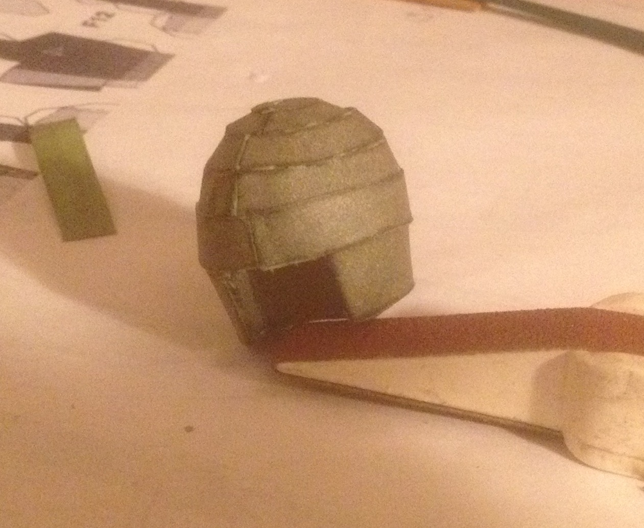 What you're looking at is two different builds. I started one, not remembering the model was on A4 paper and I didn't catch it until the helmet was sanded and prepped for texturing. FORTUNATELY, as both builds were similar, the pics for the first one will work for the second, but there is a little bit of jump.