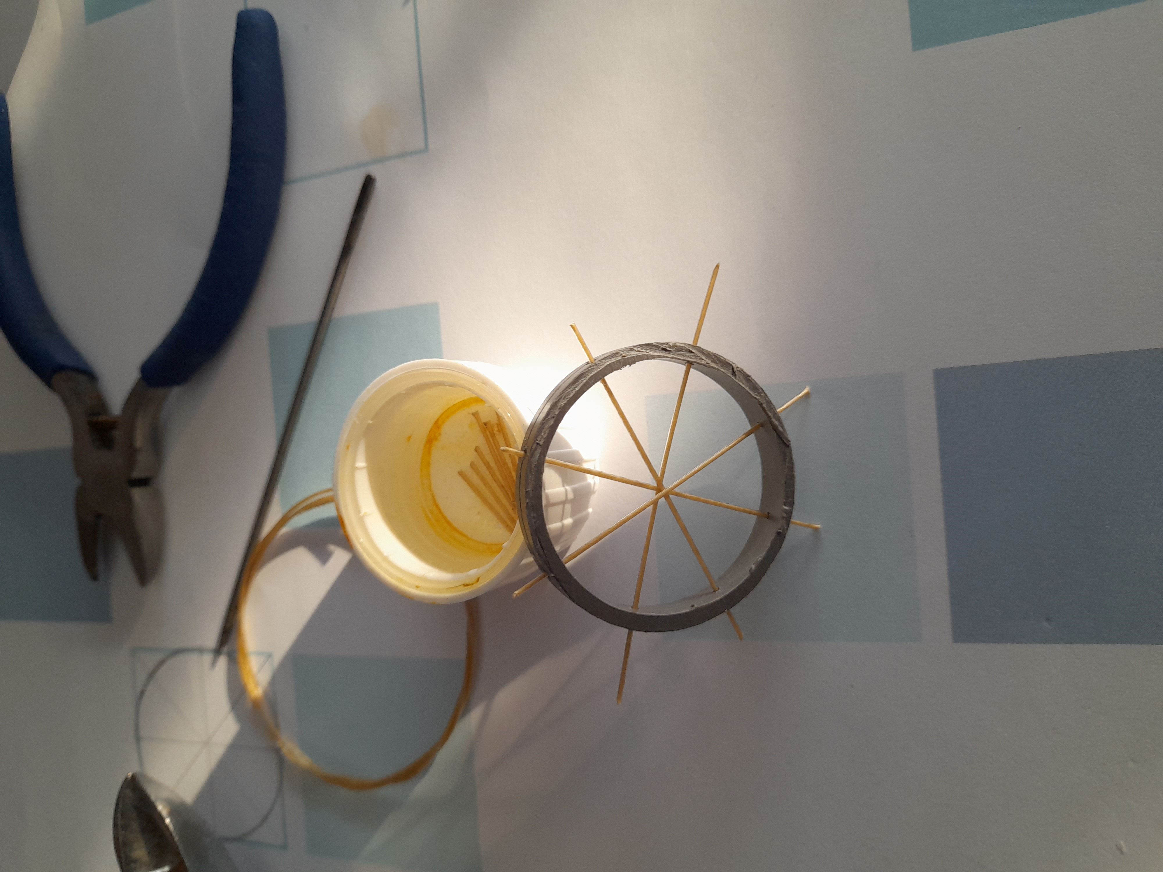 -roues=joint de plomberie pour les pneus, plastique de la boite des cartes de visite pour les voiles, bâton de "Chupa" pour l'essieu, rivets à frapper pour l'axe.