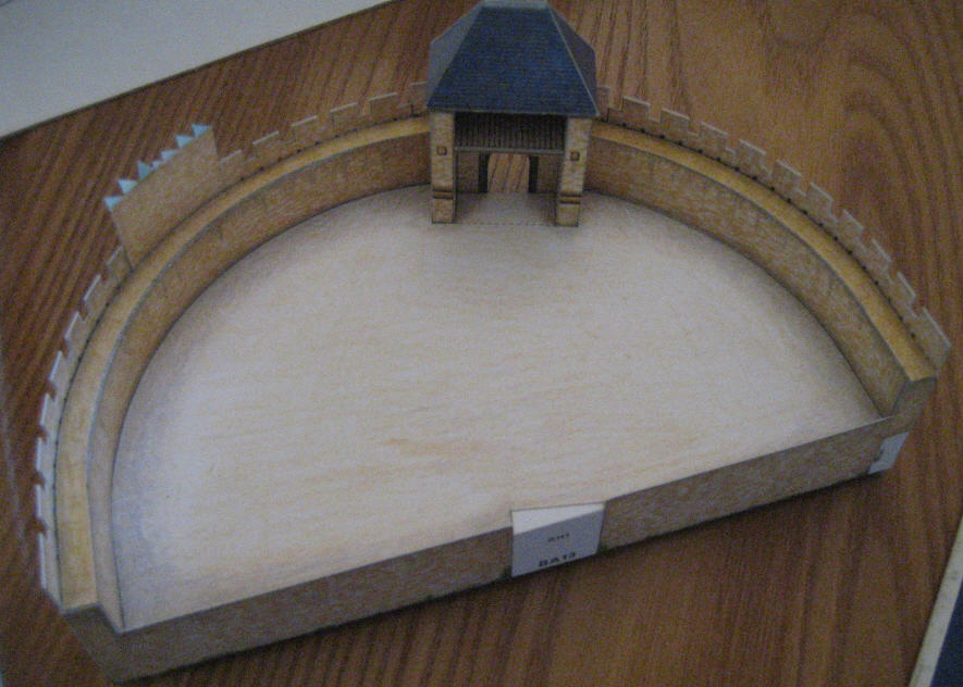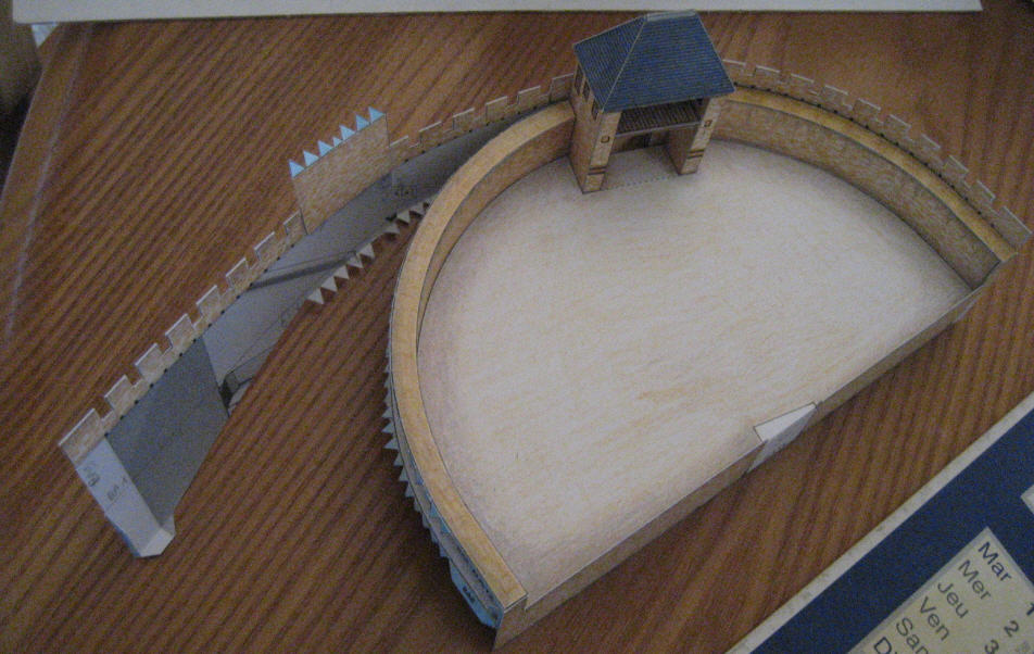 J'en ai particulièrement bavé avec ces petites maisons à assembler (une vraie maquette dans la maquette !)... Il y a deux ensembles, un de chaque côté de la barbacane. Le premier (dans l'ordre des planches) est de loin le plus compliqué, entre des toits qui vont dans tous les sens et des cours intérieures mignonnes mais pénibles à réaliser avec des doigts de taille "normale"