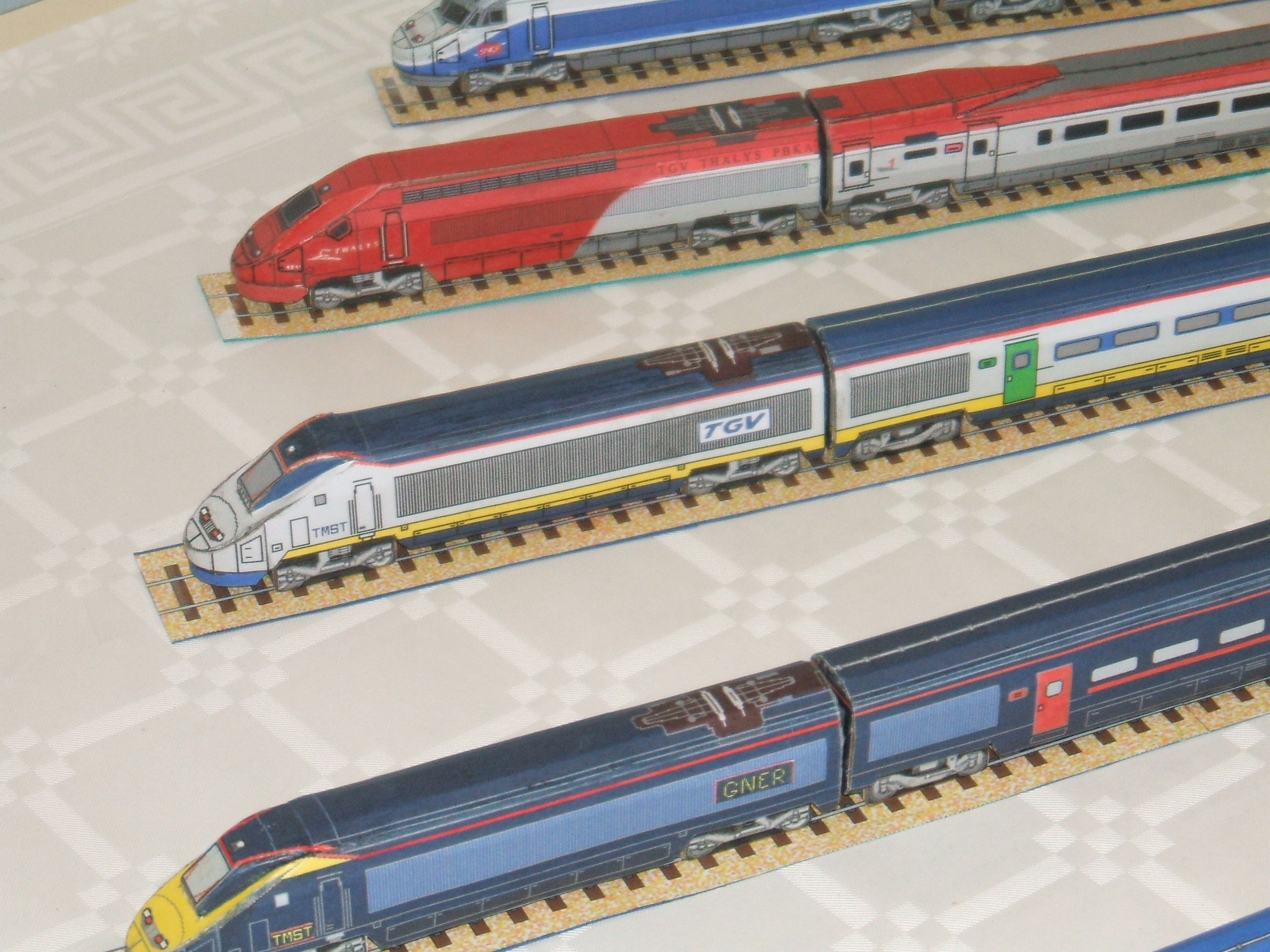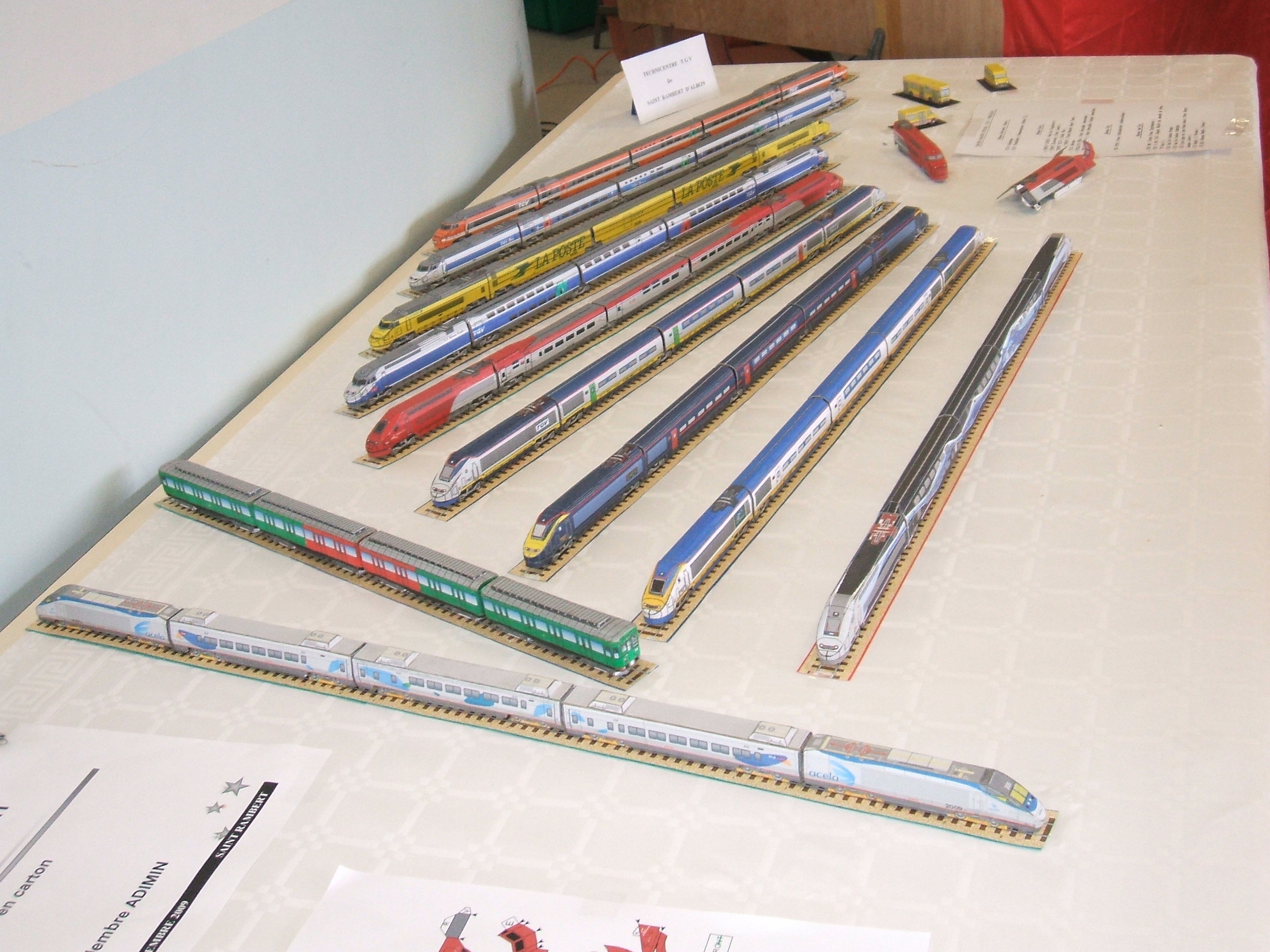 C'est aujourd'hui et demain; vous pouvez encore y aller si vous n'habitez pas trop loin.Il y a un tgv en carton (téléchargement libre); pour les autres, quelques photos prises ce matin. C'est tout près de Chanas, organisé par ardéche drôme isère miniatures (ADImin) à tendance trains, mais il y a beaucoup d'autres choses, y compris une participation monumentale de Lego . C'est quatre euros l'entrée et gratuit pour les moins de 12 ans qui peuvent y piloter un train sur un petit réseau fait exprès pour eux.