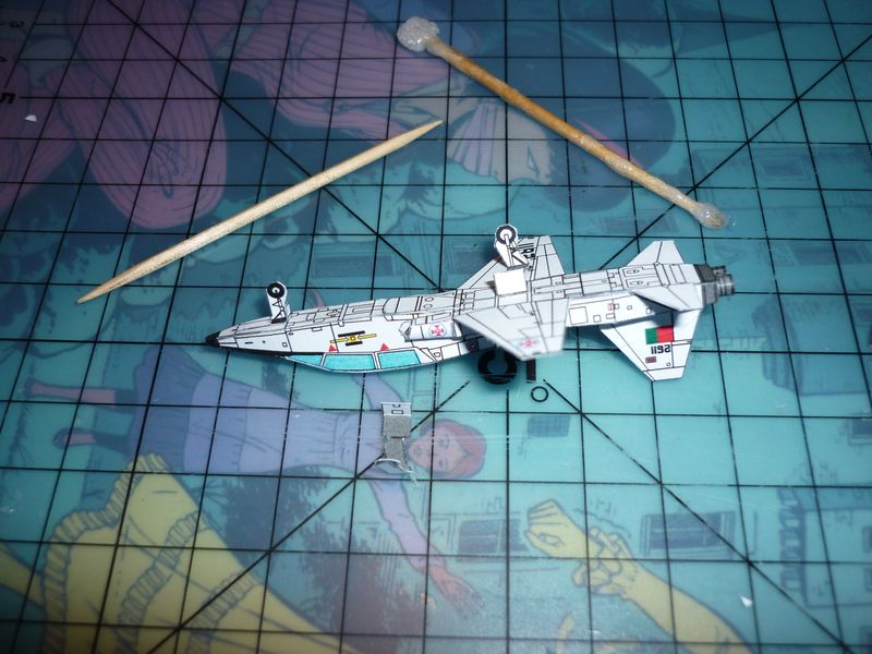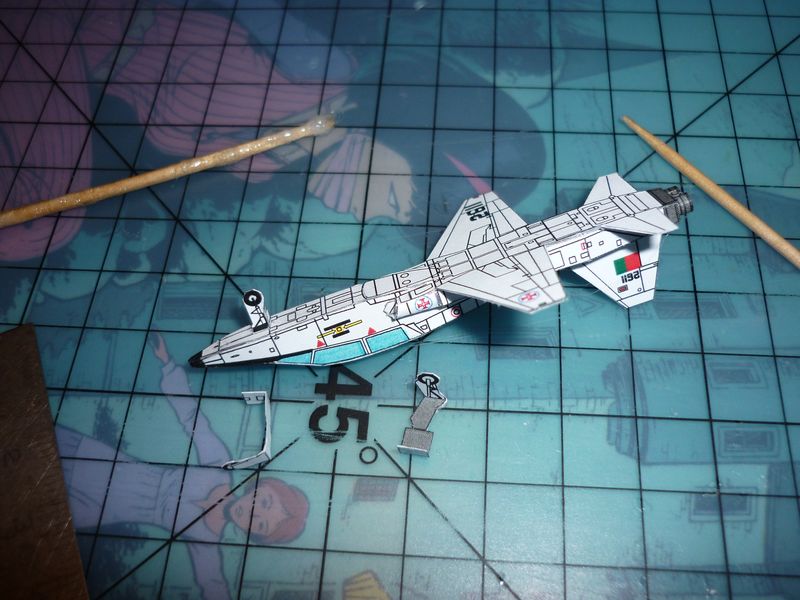 Début de l'assemblage des pièces formant le fuselage. Je ferme ensuite l'arète dorsale de l'autre côté puis je colles les deux faces de la dérive. Je finis en rabattant les pattes arrières du fuselage l'une sur l'autre.