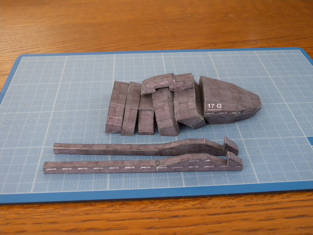 J'arrive assez rapidement à quelques pièces me permettant de concrétiser un début de l'avant du vaisseau. A cause des nombreuses lignes de pliage, le feutre est à utiliser sans modération