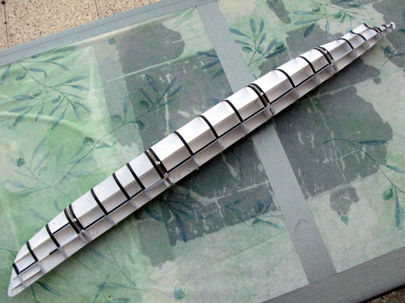 2 vues des 5 tronçons assemblés et les bandes de recouvrement des couples en place ( pour le moment ça colle): la suite avec la mise en place du recouvrement.