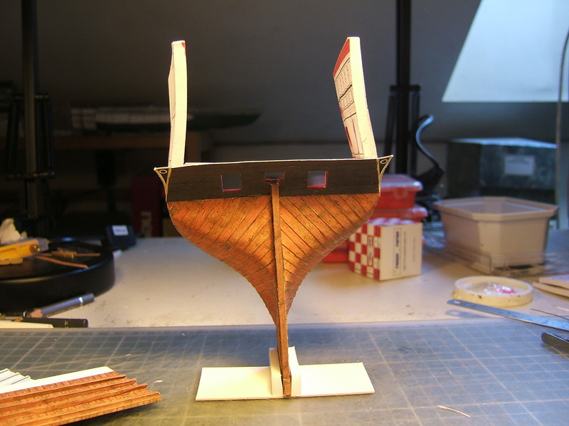 et de la muraille arrière avec ses deux sabords et le passage du timon du gouvernail.