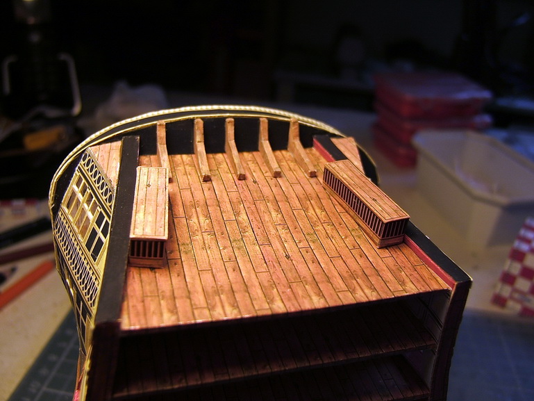La pose des renforts du tableau ainsi que des deux cages à poules, mise en place du bastingage de la dunette et des mantelets sur les sabords latéraux, et, enfin, préparation du socle avec les jambages destinés à maintenir la poupe.