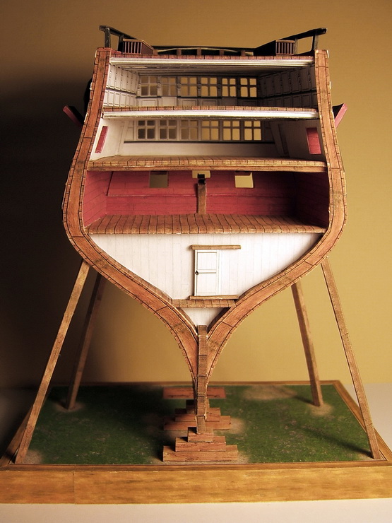 Come l'intèrieur fait un peu vide J'ai envisagé (et peut être le ferais je un jour) de le compléter en ajoutant du mobilier dans la grande salle sous la dunette, en posant un canon de chaque bord dans la deuxième batterie, et quelques tonneaux au niveau de la Sainte-Barbe.