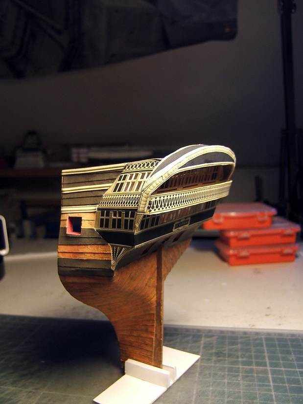La pose des renforts du tableau ainsi que des deux cages à poules, mise en place du bastingage de la dunette et des mantelets sur les sabords latéraux, et, enfin, préparation du socle avec les jambages destinés à maintenir la poupe.