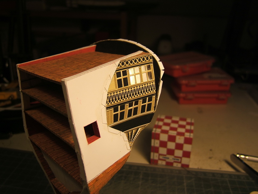 La pose des renforts du tableau ainsi que des deux cages à poules, mise en place du bastingage de la dunette et des mantelets sur les sabords latéraux, et, enfin, préparation du socle avec les jambages destinés à maintenir la poupe.
