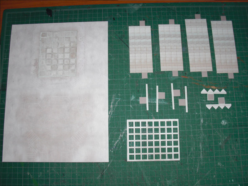Deux nouvelles planches pour le sol. Le tout collé ensemble sur un carton épais pour donner de la tenue. Les pièces des arcades de la SDT. Quatre doubles arcades fraichement montées et usées. Le tout simplement posé pour test. J'avais indiqué faire la zone de la grille mais ce sera pour la prochaine fois. L'encadrement servant à la tenir il fallait le faire auparavant...
