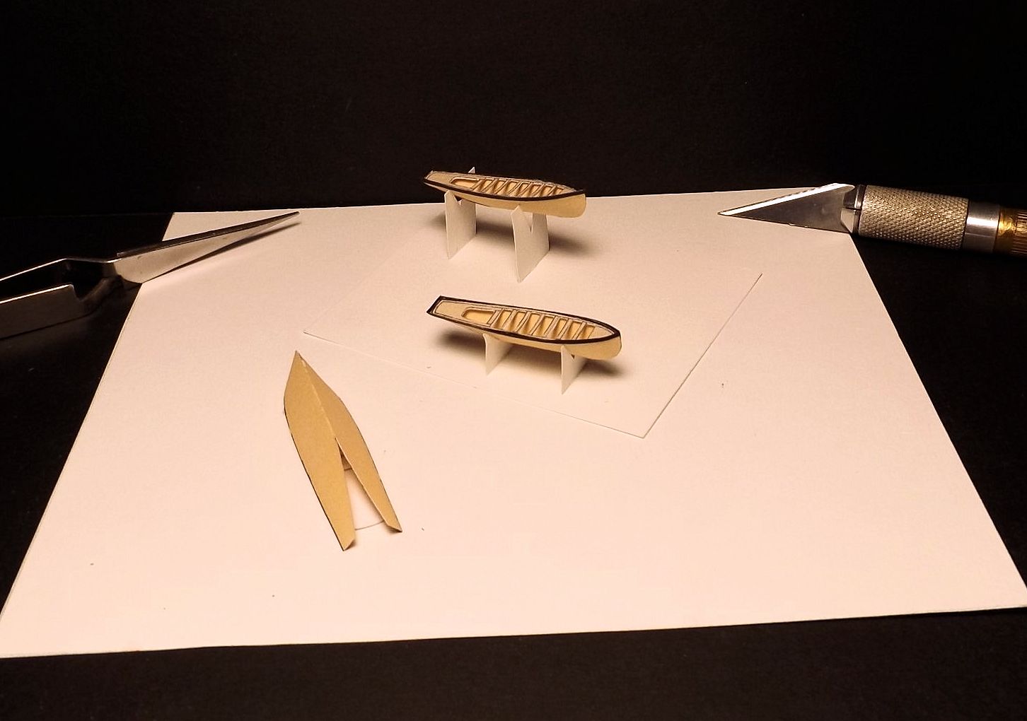 Les coques des canots à moteur sont toutes faites d’une seule pièce. Tout est en carton, sauf la structure, en contreplaqué 0,8mm.