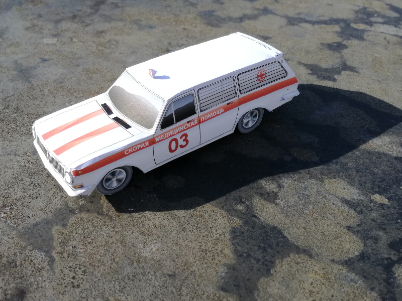 Et on enchaine avec une petite ambulance soviétique sur base de Volga Gaz 24 break. La principale difficulté était qu'il n'y avait aucune instruction de montage ni photo du modèle fini. J'ai du faire une petite recherche internet pour retrouver des photos du véhicule d'origine (heureusement faciles à trouver) pour connaitre l'emplacement de certains pièces. La fixation des roues et les roues ont aussi dues être modifiées car impossible à monter selon les pièces d'origine.