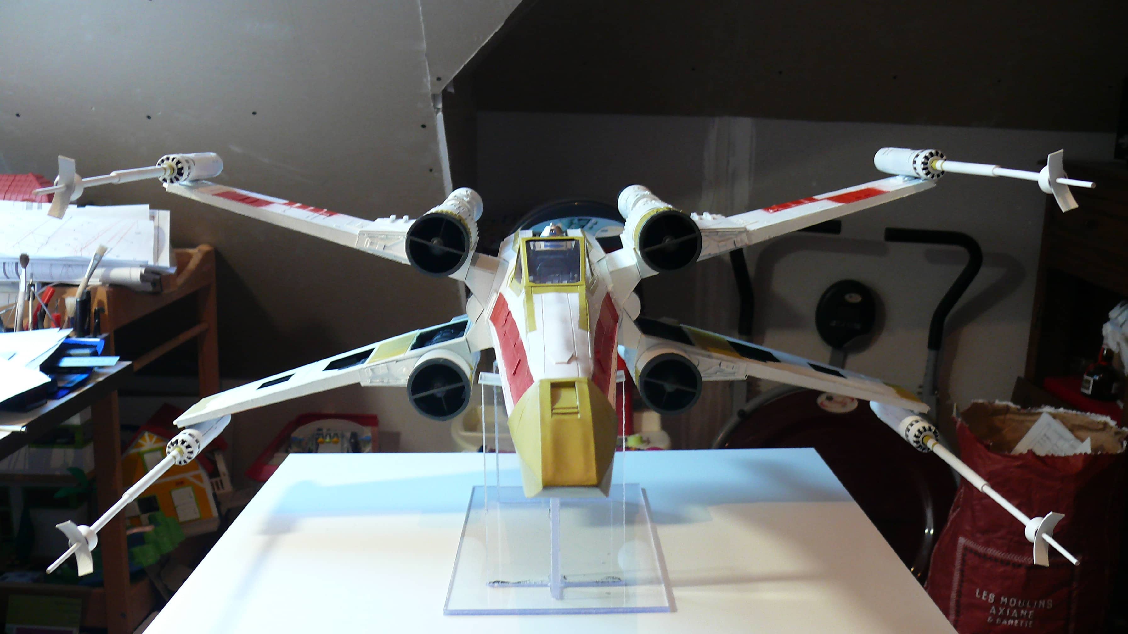 Dans le cas présent, il s'agit d'une construction entièrement en scratch : les planches du modèle de X WING de David PETHES n'ont en aucun cas servi à la construction. J'ai utilisé les planches uniquement pour avoir les cotes des pièces. Les pièces de ma construction ont toutes été tracées "à l'ancienne" à la règle, au compas et au rapporteur sur toutes sortes de papiers et de cartons issus de la récupération.