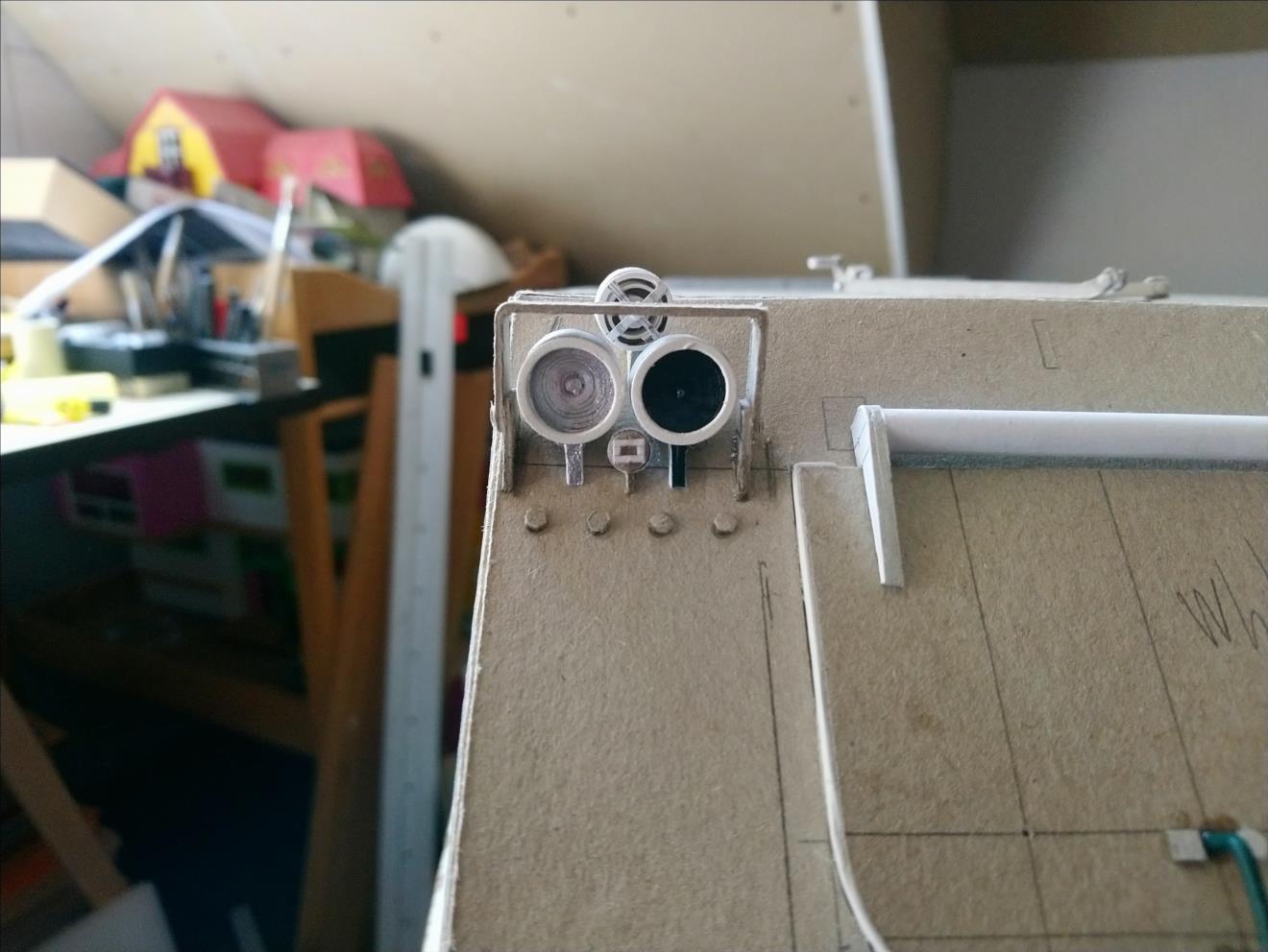 la charnière de la trappe d'accès au moteur est achevée. Le mécanisme de déploiement du pare-vague est fixé : Le pare-vague et ses charnières sont construits et positionnés (après peinture le pare-vague sera collé en place si bien que tout ce qui sera situé en dessous ne sera plus visible). Des anneaux ont été rajoutés sur l'avant vers le milieu et derrière les phares. Bonne journée.