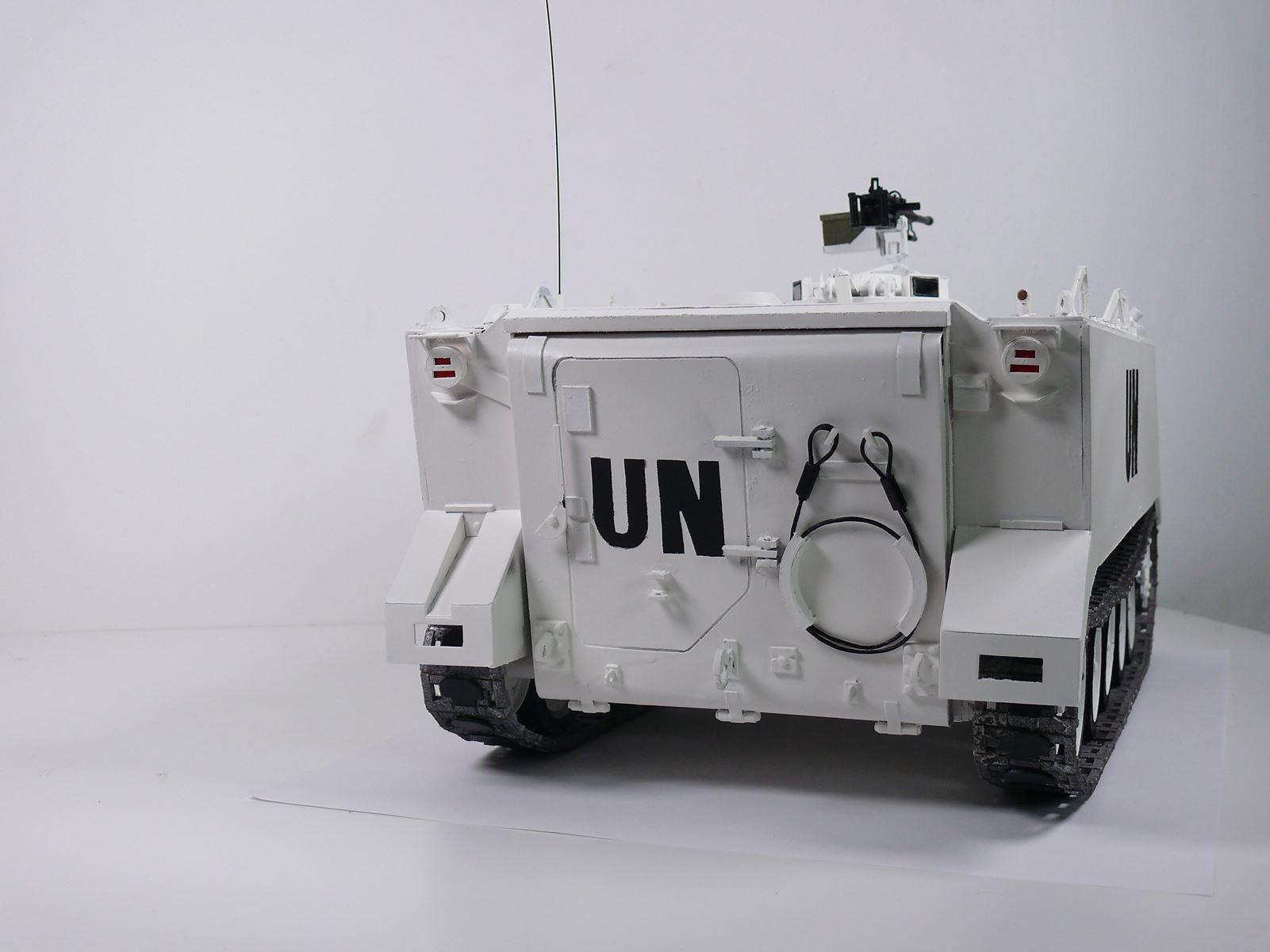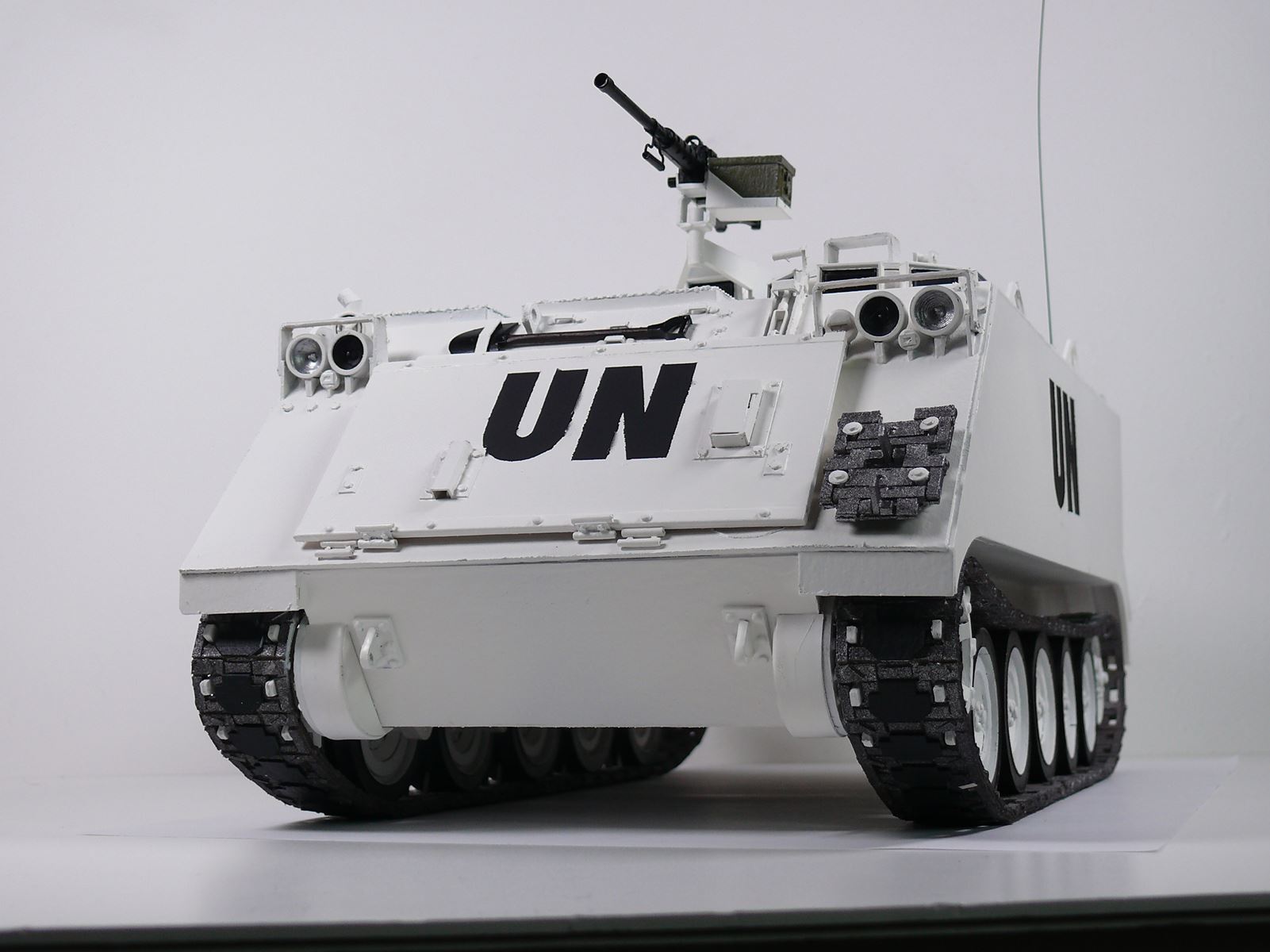 N'ayant qu'une confiance limitée sur la tenue dans le temps d'un angle formé par un morceau de carton simplement plié et jugeant la confection de la protection de la coupole au delà de mes capacités, je me suis rabattu sur un M113 du début du conflit équipé d'une mitrailleuse M2 sans protection et d'un canon sans recul M40a1. Ce qui donne ceci : A suivre...