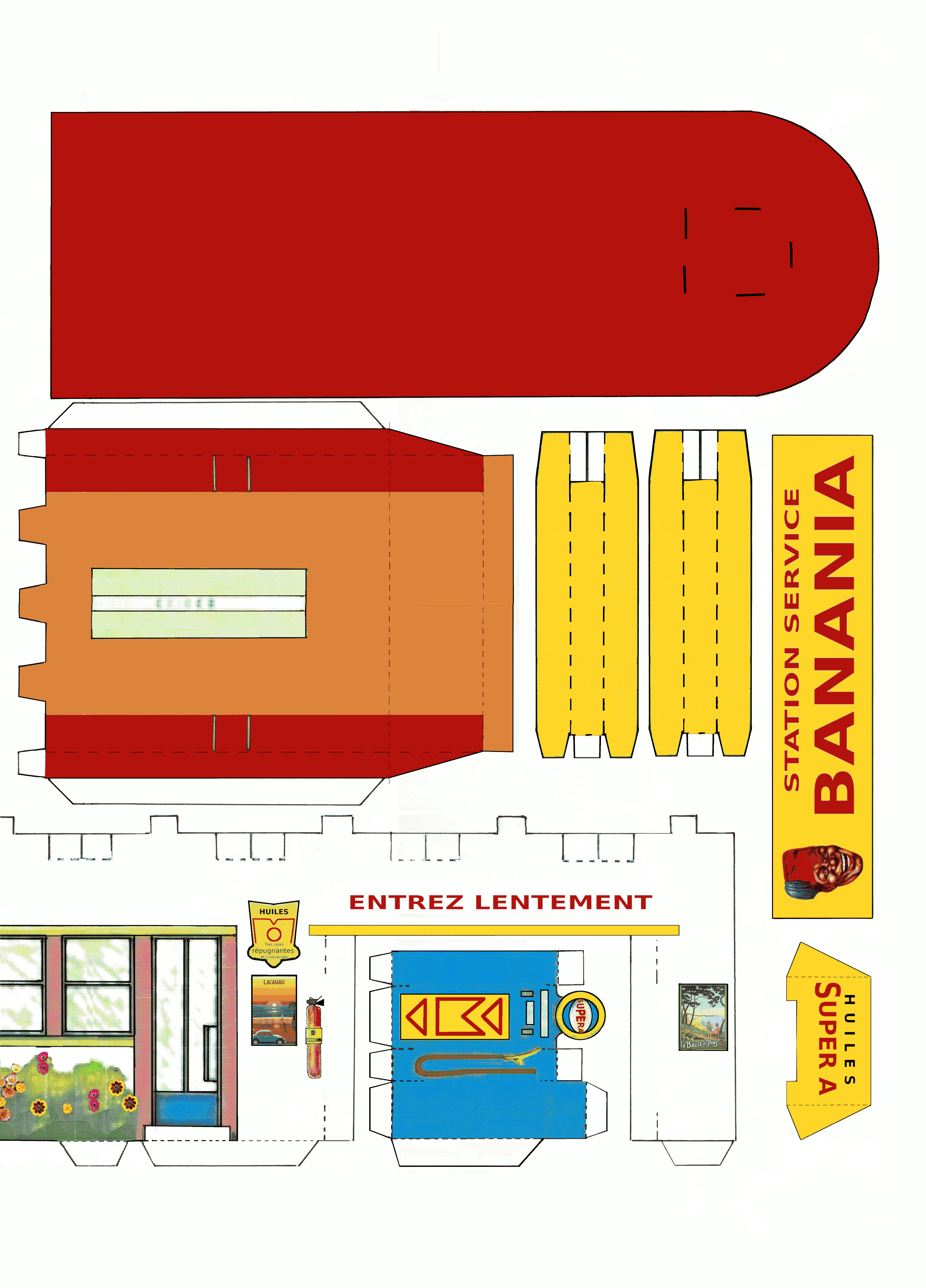Voici la station service banania nettoyée et redessinée. Les images en jpg ne sont pas extraordinaires, mais je ne sais pas mettre des fichiers en xcf sur le forum, ils sont toujours trop gros, ce qui est normal. J'ai dû réduire à 48 couleurs, puis de 600 à 300 points par pouce et enfin faire une compression jpeg à 85 pour passer en dessous des 2M fatidiques. La définition y perd.