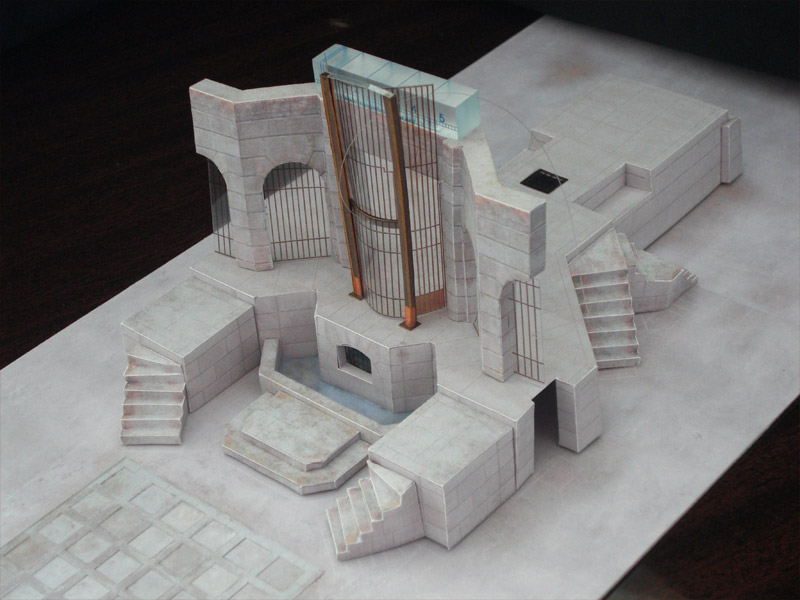 La petite grille sur laquelle est posée le chaudron est également en place au sol. Collage des poutrelles et des arcades avec les colonnes. Les grilles sont également en place tout autour pour fermer la salle.