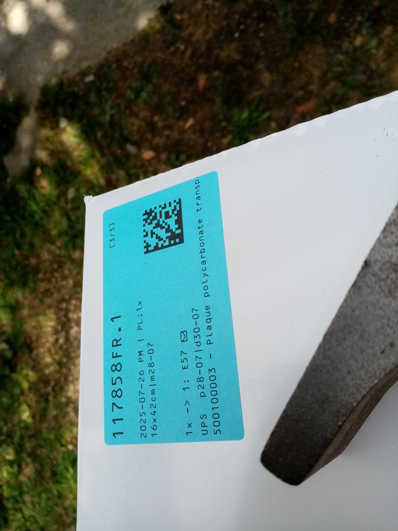 Le poids est un morceau de rail de chemin de fer que je suis allé emprunter sur la voie derrière chez moi.... Le tout est dehors pour les UV. En ces temps de canicule, ce n'est pas ce qui manque. Autrement, il faut une lampe à UV. Les deux petits côtés sont entre les deux grands et le sommet est par dessus le tout. Si la colle ne tient plus, il ne tombera pas sur le modèle. Le polycarbonate fait 3mm d'épaisseur. Il est très transparent, c'est avec ça que sont faites les visières de casques de moto.