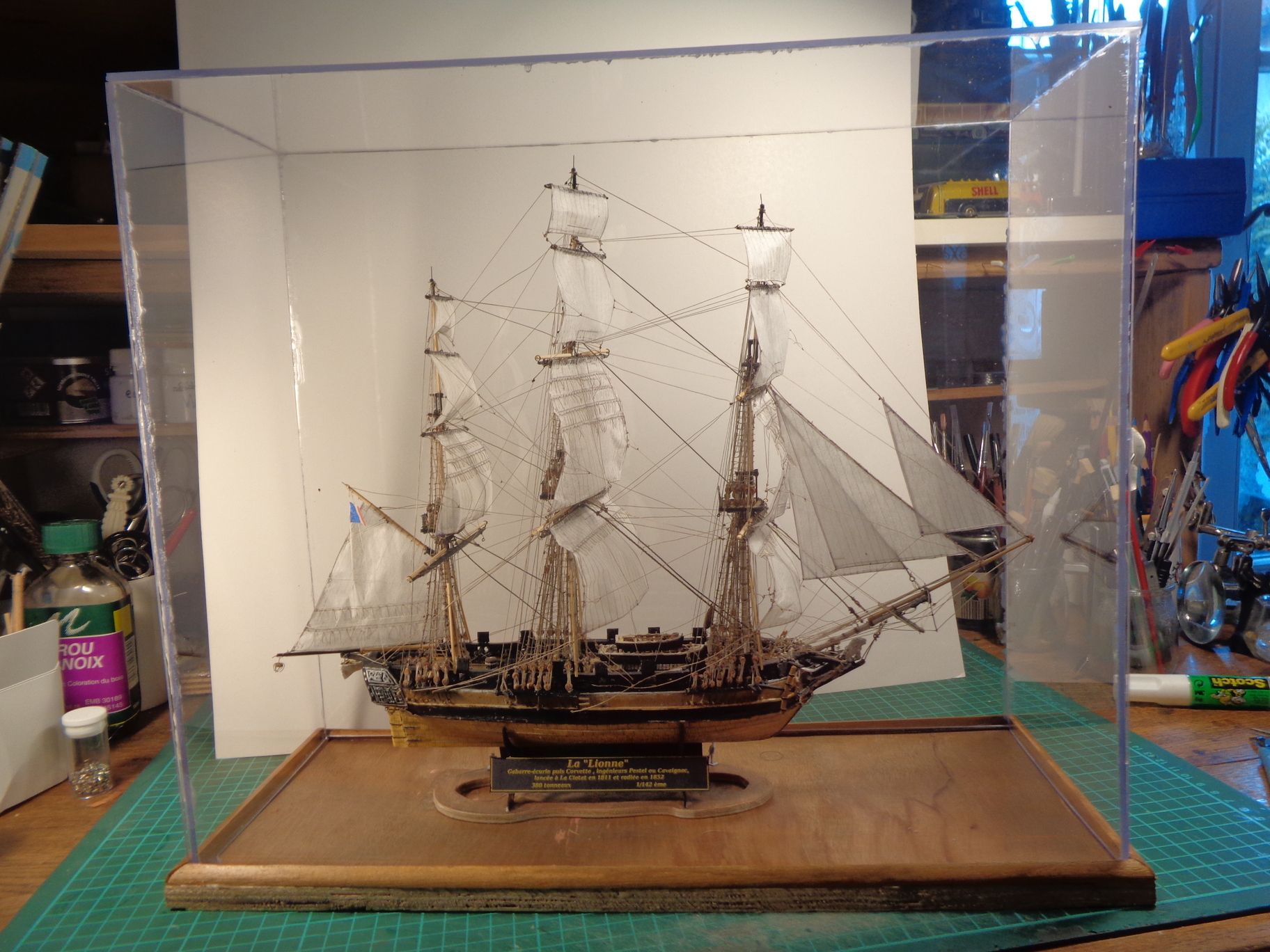 Voici le rendu avec le bateau dedans C'est très sujet à l'électricité statique. Quand j'ai enlevé la feuille de protection, je voyais les poils de me bras se hérisser comme sur les images de personnages montés à haut potentiel autrefois. J'ai mis le tout à la terre avec un tube de cuivre qui traînait par là et qui a tout équilibré, la vitrine, le monde et moi. Il faut donc prévoir des tissus antistatiques pour nettoyer l'objet. Je cacherai peut être les coins plus tard avec une petite bande , sans doute noire, pour être en accord avec le navire.