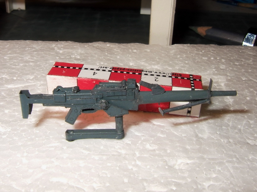 En premier le support. Je l'ai fait orientable d'abord le bras et ensuite le support. Voila l'arme terminée ( en fait il s'agit d'un Fusil mitrailleur) Le même avec son rack à munitions