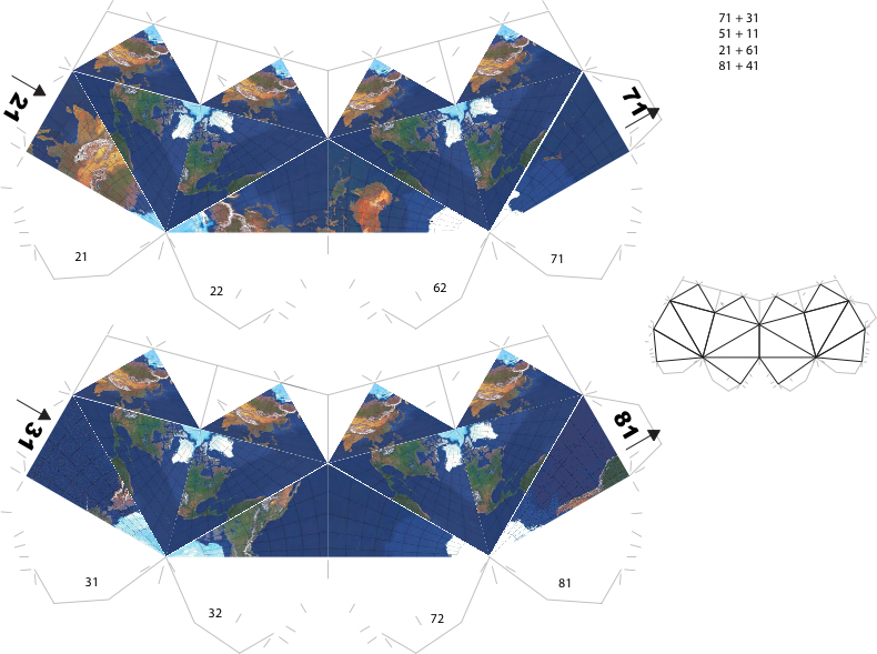 Une fois les deux planches découpées, il faut former les tétraèdres. Les plis de jonction entre les tétraèdres doivent être pré-pliés dans les deux sens. Les numéros permettent d'attacher les chaînes dans le bon ordre. « 71 + 31 » signifie qu'il faut attacher la droite de la première chaîne avec la gauche de la deuxième, etc. Pour améliorer la solidité et la durabilité, j'ajoute un morceau de ruban adhésif sur chaque pli de flexion, des deux côtés.
