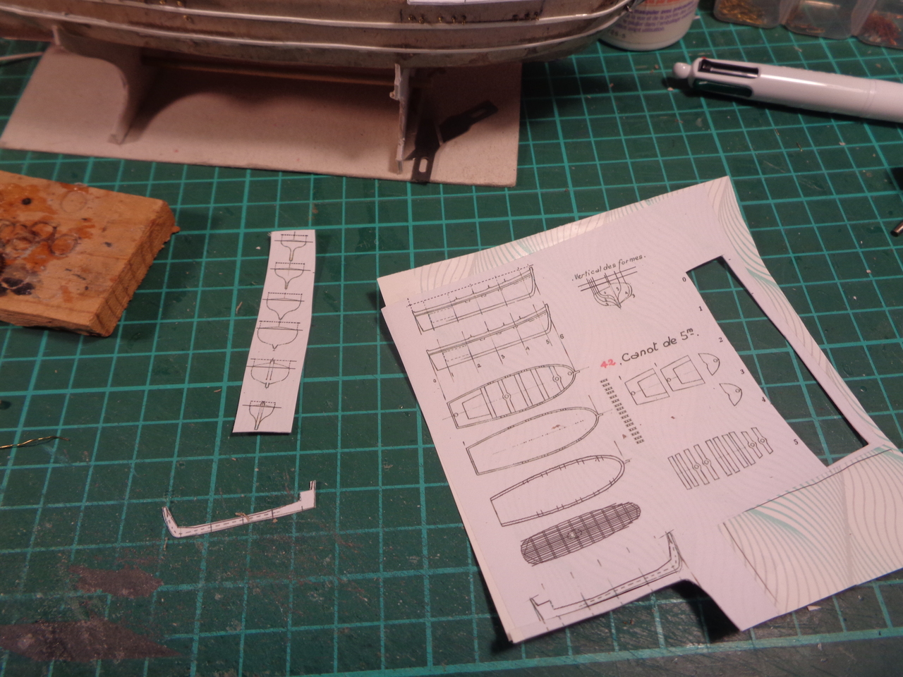 J'ai complété le dessin du plan , imprimé sur du 80 grammes et collé ça sur du carton de très basse qualité, à peu près 160g. J'ai extrait le dessin des couples et dessiné une quille, j'ai fait des petites pièces comme les supports des dames de nage ou les bancs. Je donnerai une planche provisoire .