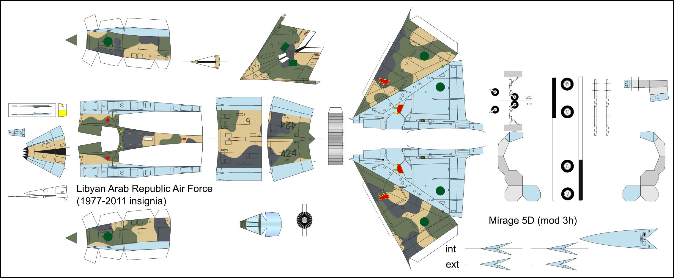 On remplace le nez du Mirage 5DE par celui du 5F ou celui du IIIRD et on obtient des Mirage 5D et 5DR libyens. Les tons verts et sable échangent aussi leur place. Le DE d'interception et le DD biplace existaient aussi dans ce camo "inversé".
