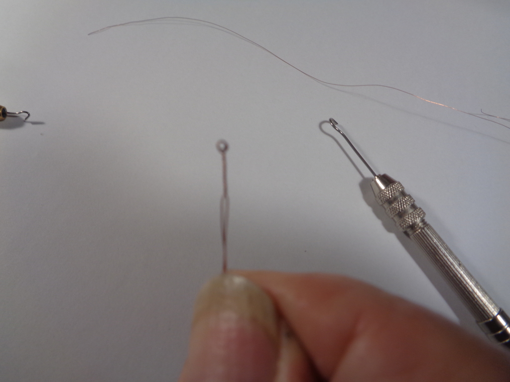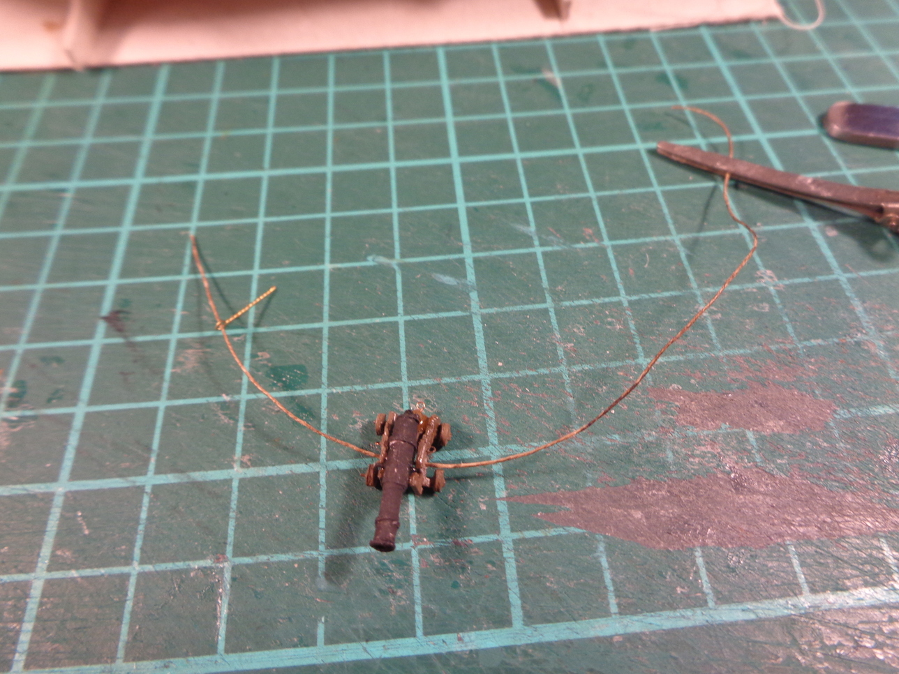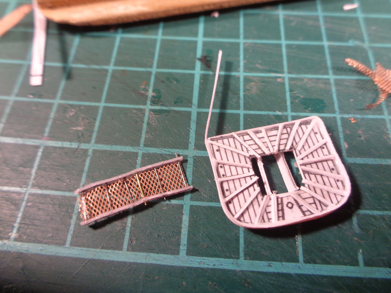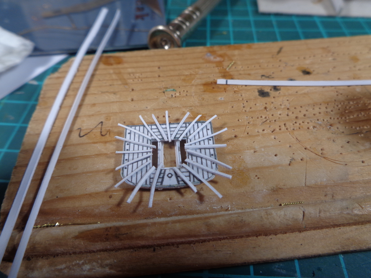 J'ai commencé par essayer de faire une des rampes avec le filet de sauvegarde. La photo n’est pas bien bonne, mais voici la première. Deux bandes très fines de carton, percées à 0,3 mm avec des fils de laiton du même acabit dans les trous.Ça paraît tout de travers mais une fois remis en forme et les longueurs inutiles coupées, ce sera très bien.
