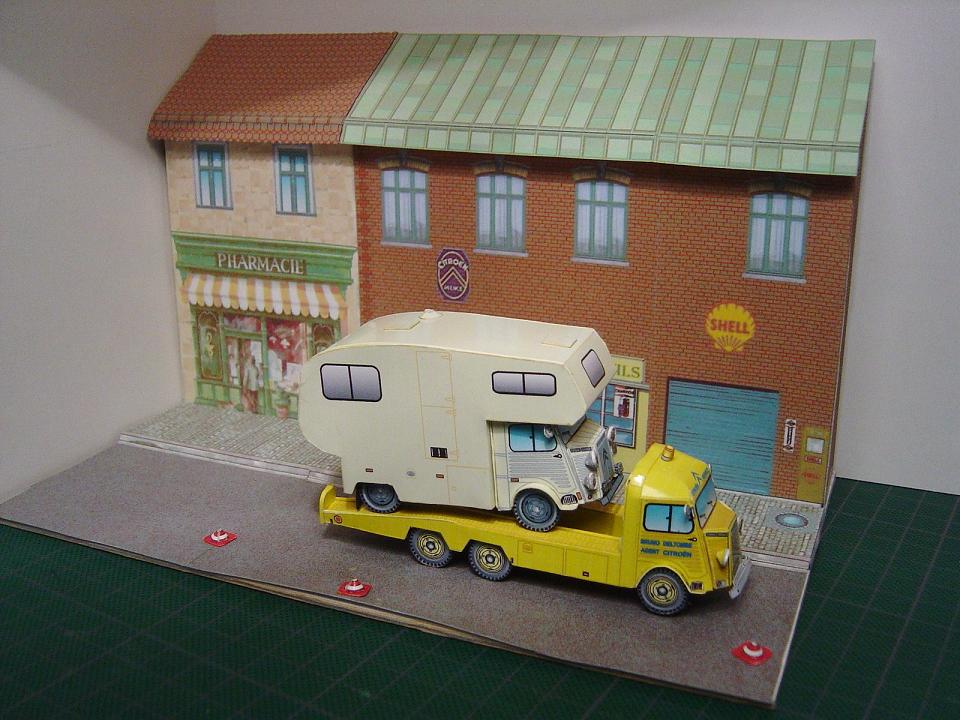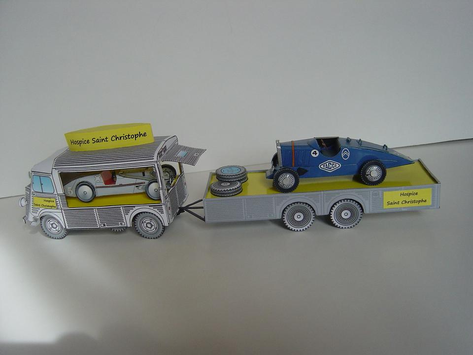 Une base imposée, un modèle de Camille, redécoupé en "vitrine", pour y loger la Voisin Laboratoire de Pierreg, et en bricolant le camping car 6 roues, toujours de Camille, pour en faire une remorque pour présenter le Rosalie d'Amigamaquette !