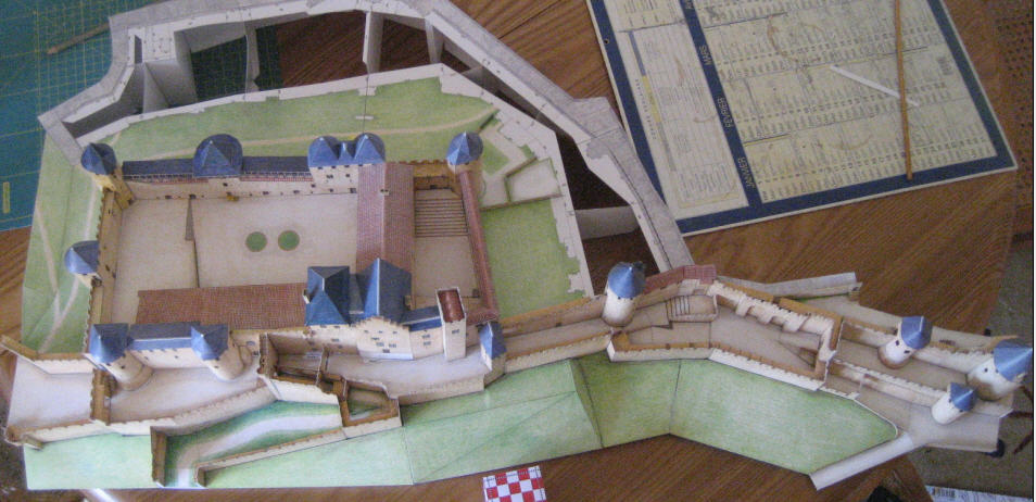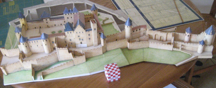 J'ai presque fini la maquette ; il ne me reste plus qu'à assembler de petites maisons et la barbacane, qui viendront combler les trous restant