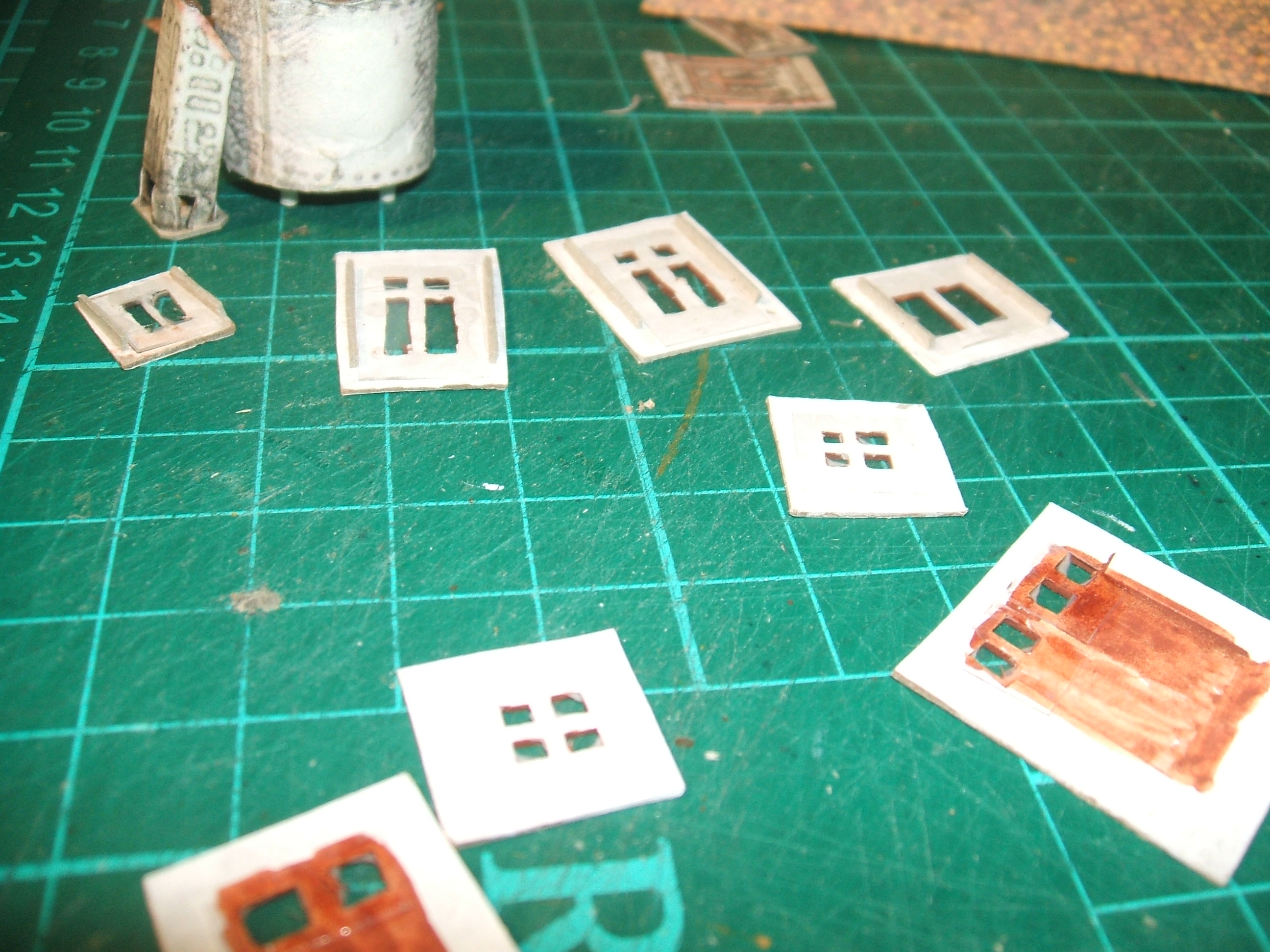 Les pièces de la gamelle et l'outil. Les découpes ne sont pas belles. Si je devais en refaire, je collerai l'empilage sur un bout de cure dents et je tournerai l'ensemble sur la mini perceuse. On rapporte les anses après puis on décore et enfin on détache du support. Voilà le résultat brut; j'ai ensuite dégrossi au cutter pour obtenir ce qu vous avez déjà vu Les huisseries et les murs où j'ai déjà masqué l'essentiel des dessins de ce que je fais en volume. Pour les huisseries, j'ai essayé une nouvelle méthode inspirée de la roue de la brouette. On découpe le carré principal qui est assez grand puis on découpe les barreaux sans s'occuper des contours; on obtient une sorte d'araignée qu'on ajuste à la bonne dimension dans son cadre, obtenant ainsi des beaux évidements sans jurons.Une goutte de colle à bois et les pièces sont prêtes à la peinture. On peut faire des barreaux fins avec un carton épais à suivre