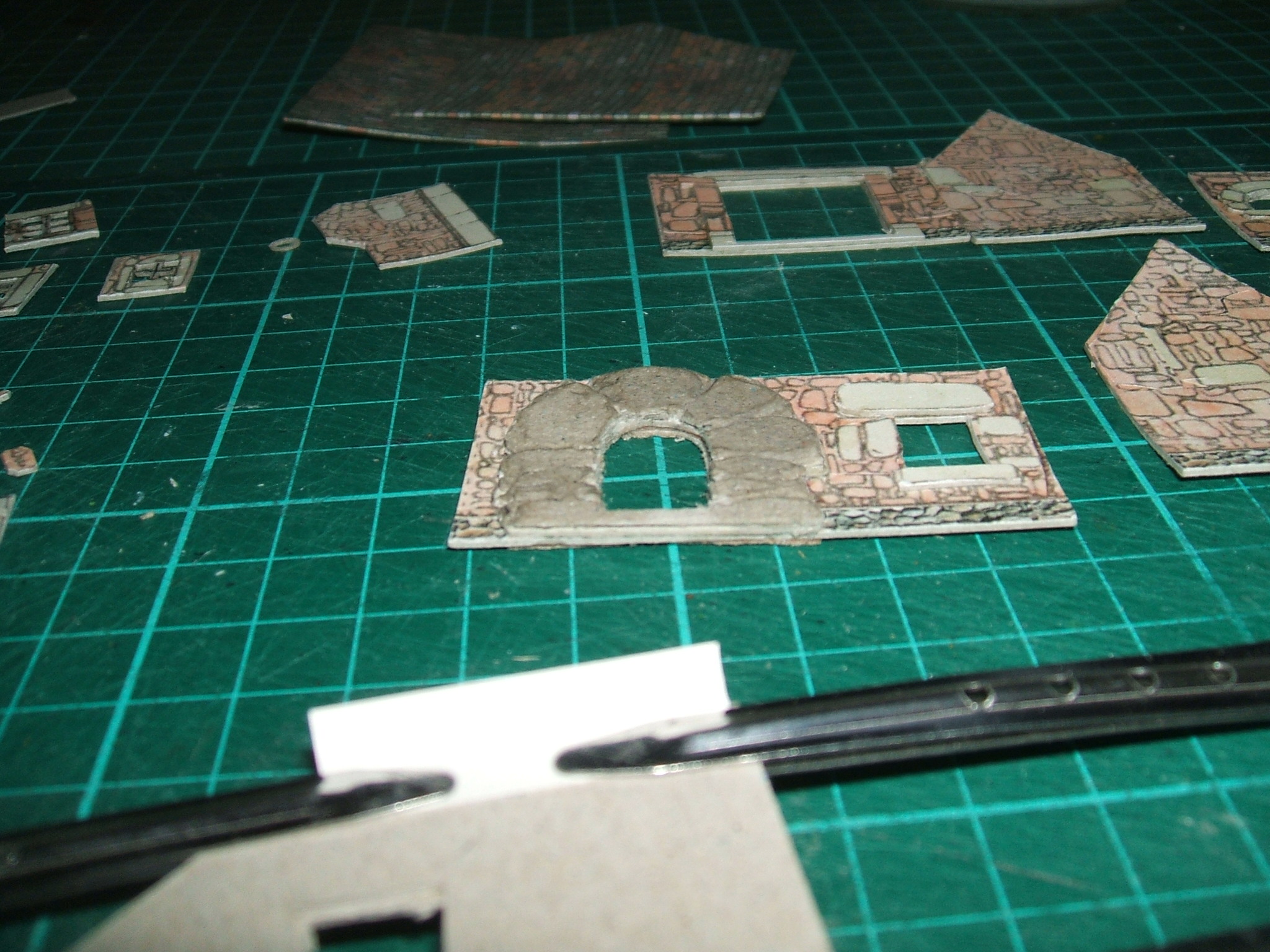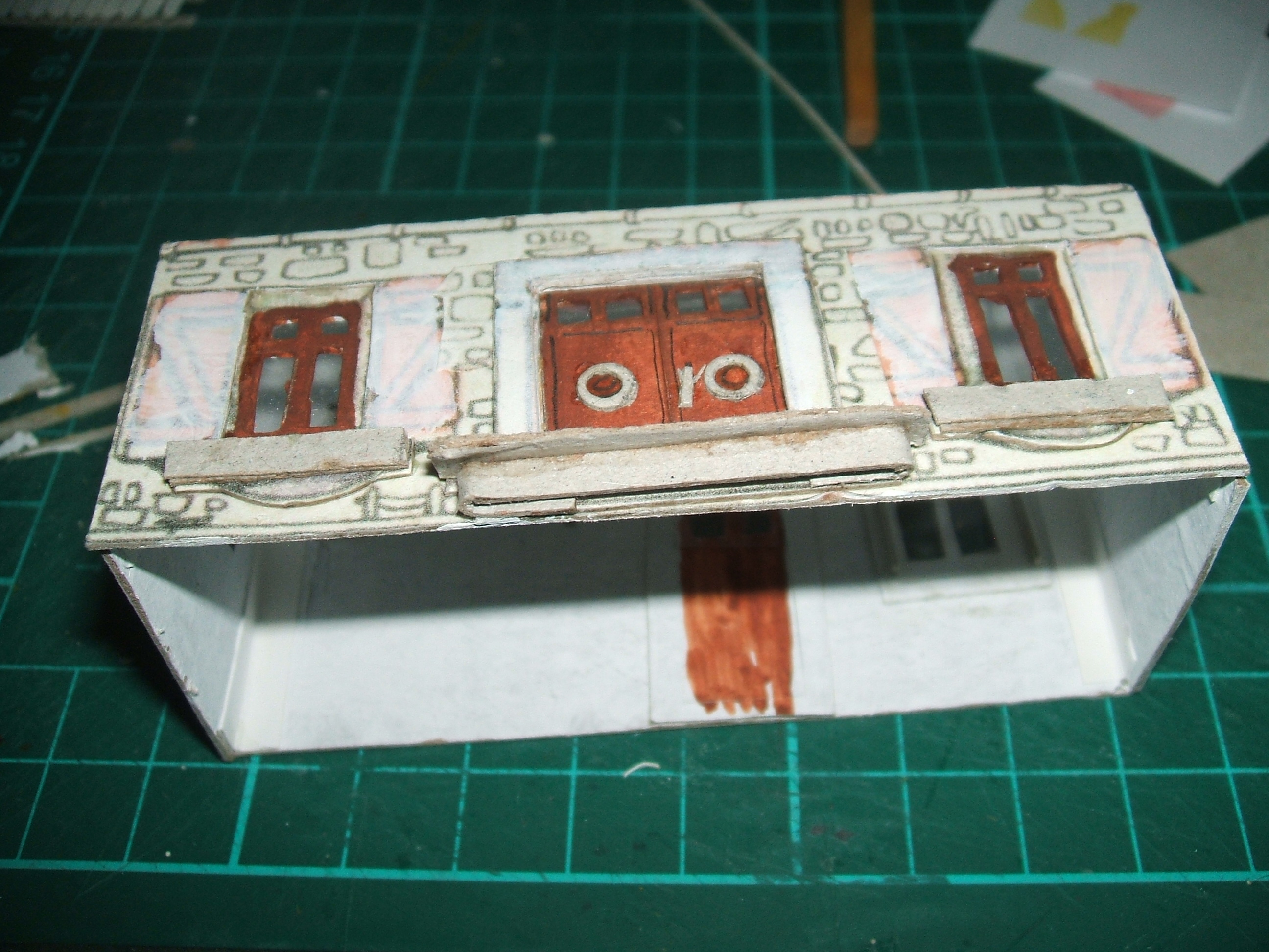 Les toits recouverts de tuiles, les murs rehaussés garnis de galets, le percement des ouvertures , la suppression des dessins des objets rapportés et le collage des languettes de liaison entre les pans de murs. Je rappelle qu'il est plus facile de coller droit les murs comme ça qu'en les pliant, avec un carton épais. On rattrape mieux les problèmes d'équerrage. En haut à gauche, le bassin sèche sous presse tandis qu'à droite on voit la niche et la gamelle. Au milieu à gauche, les volets rustiques. Voyez aussi à gauche le bouchon applicateur du bidon de colle. Je ne m'en sers plus jamais. J'utilise des pinceaux, plus ou moins gros selon la taille du collage. Ne prenez pas des pinceaux en martre kolinski mais des pinceaux premier prix pour bambins. Donnez vos pinceaux en martre à des artistes nécessiteux.