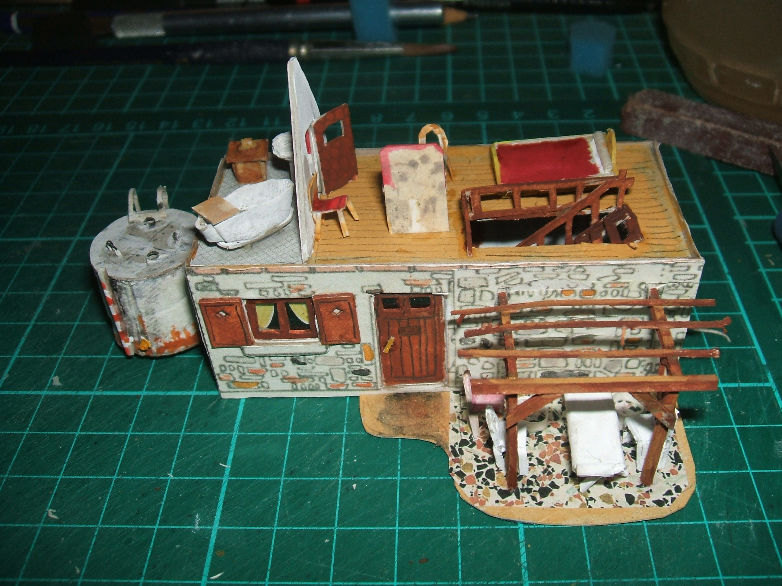 Présentation des divers accessoires internes. En arrière plan, on voit que le toit a reçu ses tuiles canal. La place est comptée les supports de l'abri de porte sont posés décoration des accessoires noter la cuve que je trouve très réussie. Il y a une petite commode dont je n'ai pas parlé, mais ce ne sont que deux bouts de carton. J'utilise souvent le dessin au crayon peint ensuite à la peinture à l'eau pour faire les détails simples. Le crayon protège et écrase un peu le carton qui boit moins la peinture à l'eau à cet endroit? Ça donne un peu de relief pour pas cher et peu d'effort. tous ces objets sont tracés à main levée au gré de l'inspiration du moment et souvent je n'ai pas de dessin à vous proposer. En regardant bien les pièces brutes on voit les principes et je pense que ce doit être facile à imiter. Dans la prochaine, j'ai quand même tracé la brouette. à suivre