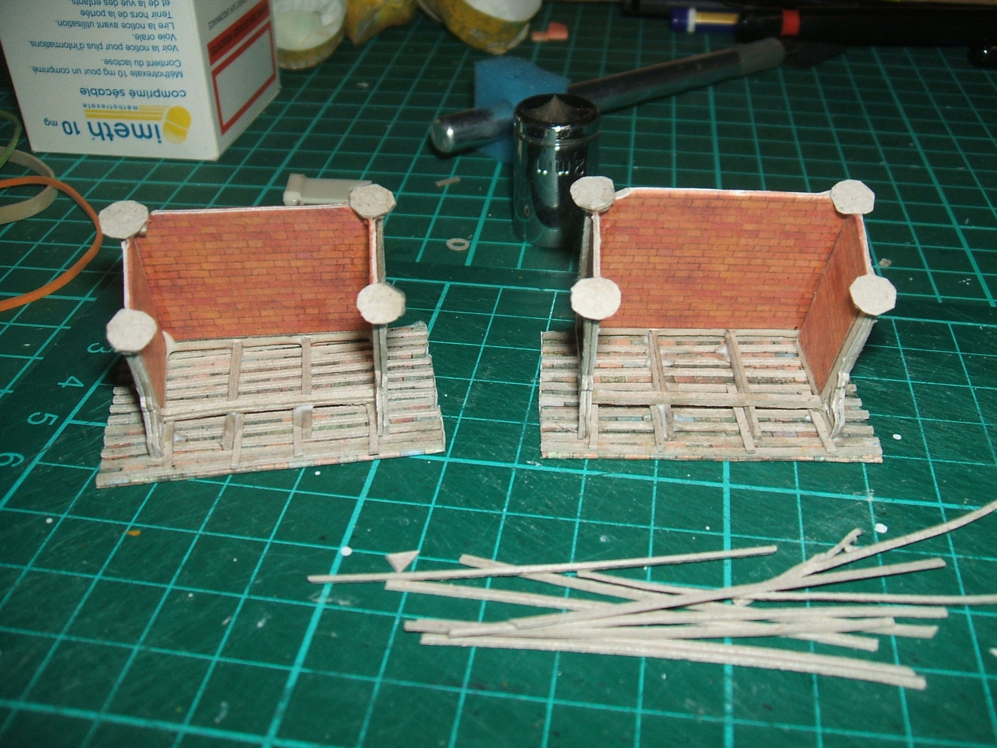 séchage des deux squelettes sous presse; la poutre est une baguette chinoise. La brouette a retrouvé ses esprits et son chargement la brouette, son chargement et la gamelle des chiens qui va avec la ferme. Cette photo est le maximum que je peux faire avec mon appareil (macro +flash+moins de pixels). Les deux hangars; noter que les murs sont plus longs que la charpente. En bas de chaque poteau, il y a un plot sans doute de béton fait avec un empilage de rondelles de carton. On les voit bien sur la planche initiale. Il faut prévoir le dégagement en bas des murs. Le fagot de baguettes de carton va nous servir à faire une charpente à nos petits hangars La photo parle d'elle même; j'ai fait un hangar plus bas que l'autre (c'est volontaire!). les deux hangars cul par dessus tête pour exposer leurs charpentes; il y a même des barres rallongées, comme en vrai à suivre