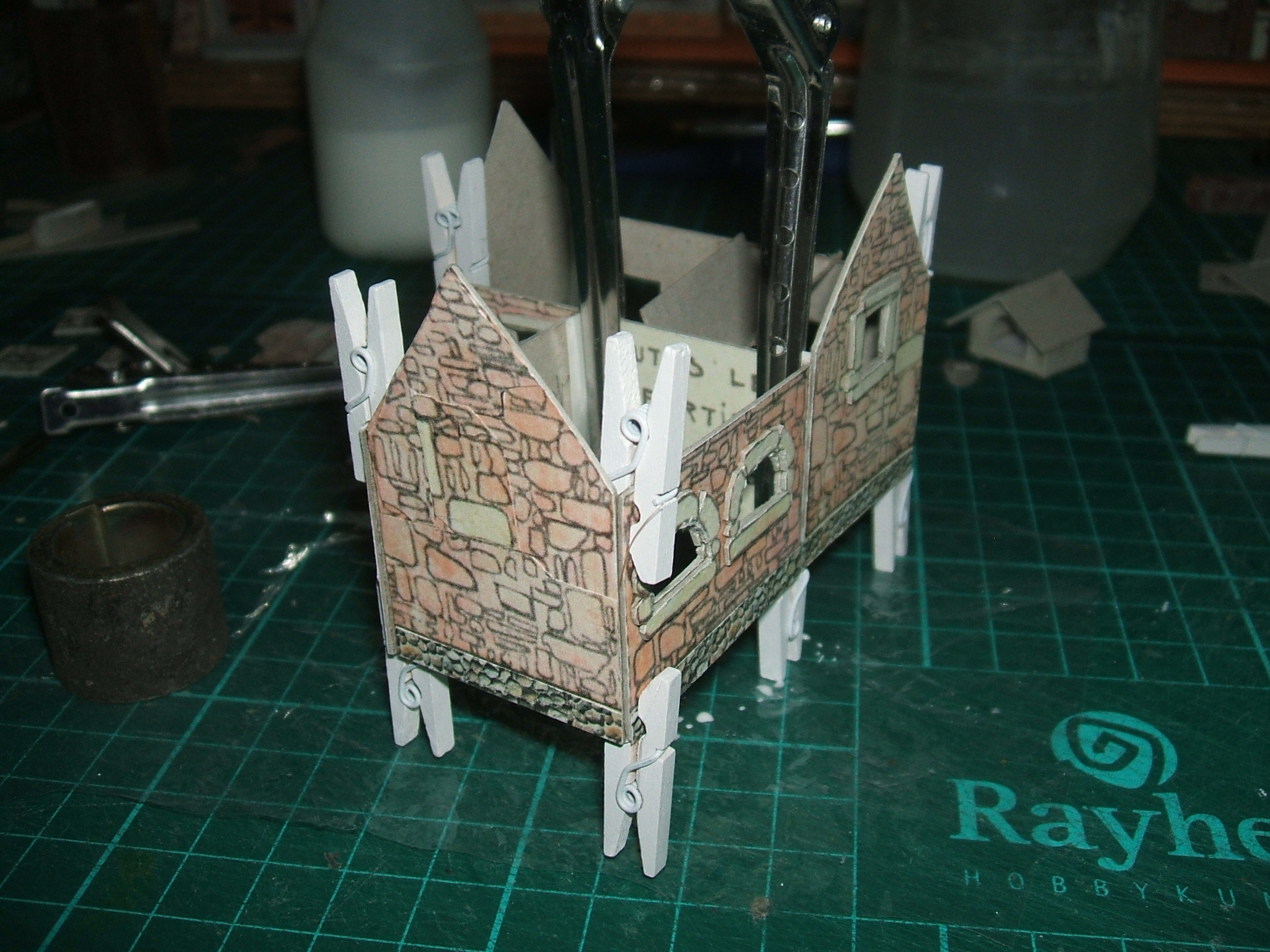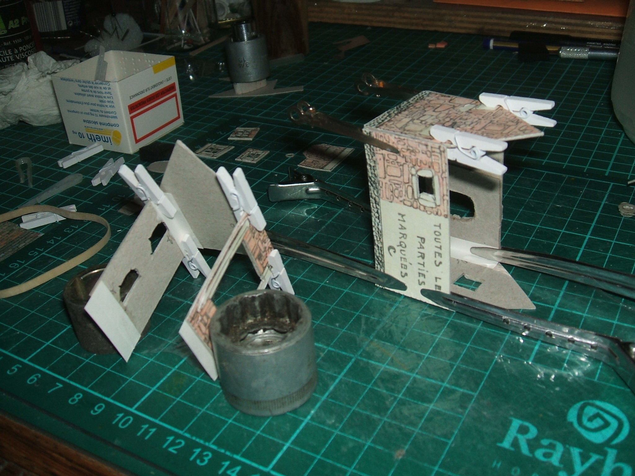 À gauche, l'assemblage des murs avec des languettes rapportées, au centre la citerne reçoit ses quatre pieds et à droite, le toit sèche sous cale et punaises. Sa forme ne facilite pas la mise en place Le collage des chiens assis; un élastique tendu à travers le toit plaque les deux chiens assis. Une cale en carton invisible est insérée provisoirement à la base du toit pour éviter qu'il se déforme. Noter à droite les Z rapportés sur les volets.
