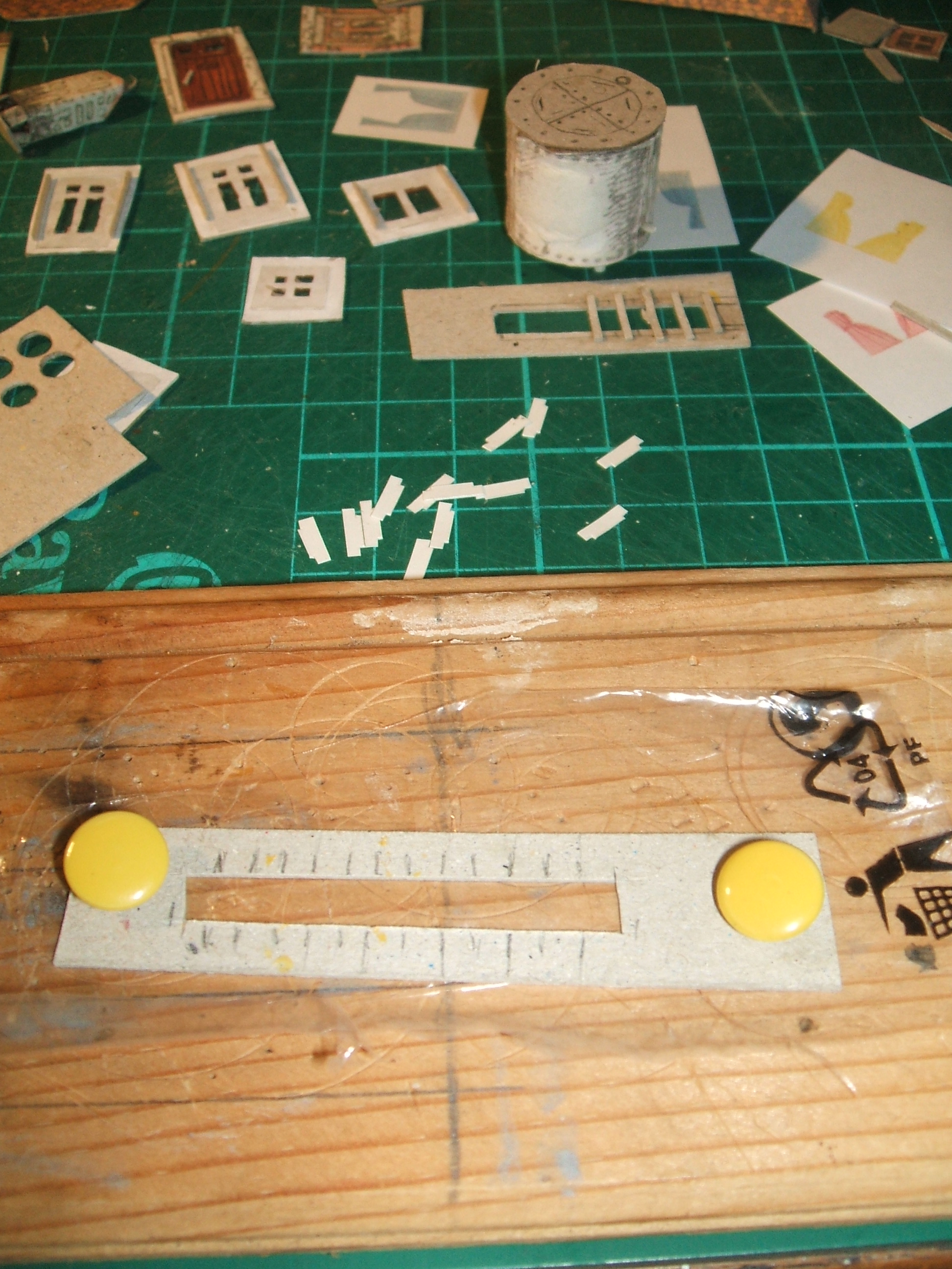 À gauche, l'assemblage des murs avec des languettes rapportées, au centre la citerne reçoit ses quatre pieds et à droite, le toit sèche sous cale et punaises. Sa forme ne facilite pas la mise en place Le collage des chiens assis; un élastique tendu à travers le toit plaque les deux chiens assis. Une cale en carton invisible est insérée provisoirement à la base du toit pour éviter qu'il se déforme. Noter à droite les Z rapportés sur les volets.