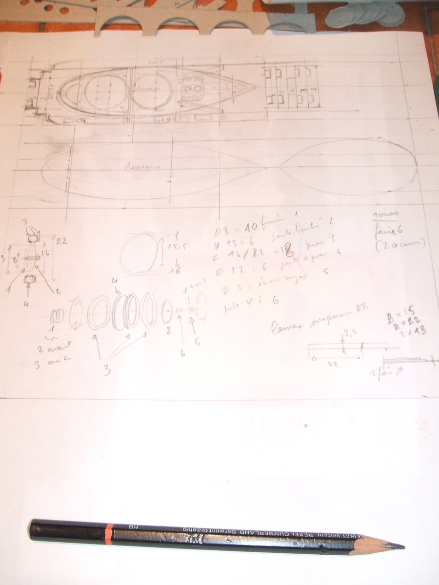 Pris plus que de raison par de très nombreuses choses n'ayant rien à voir avec le forum, je n'ai pas fait de planches à proprement parler. Je suis parti du modèle shell berre imprimé en A4, d'articles internet et de croquis pris dans le peu de documentation disponible. J'ai aussi fait à main levée le dessin de quelques unes des pièces modifiées ou ajoutées et j'ai fait des photos du montage que je vais commenter.