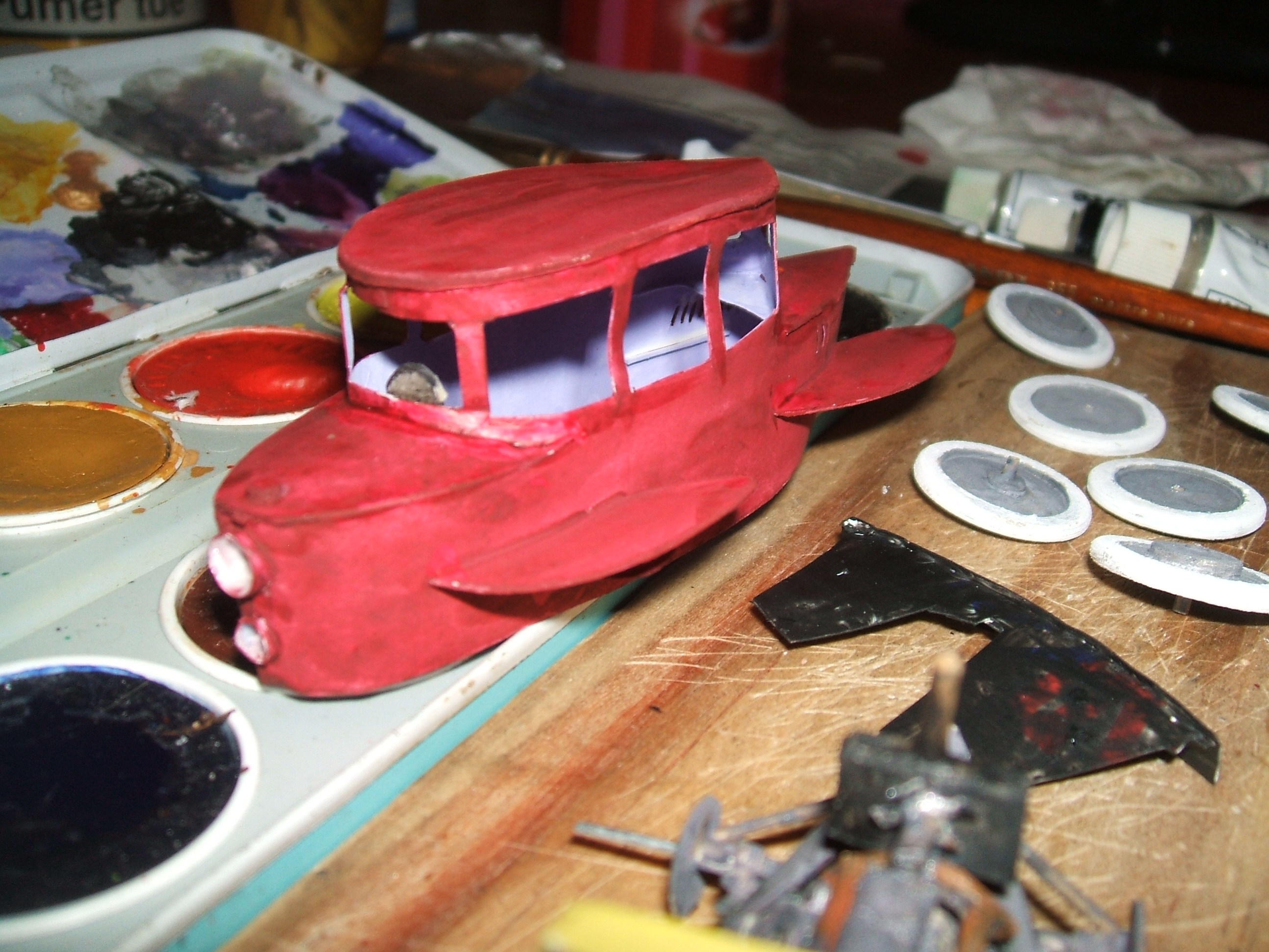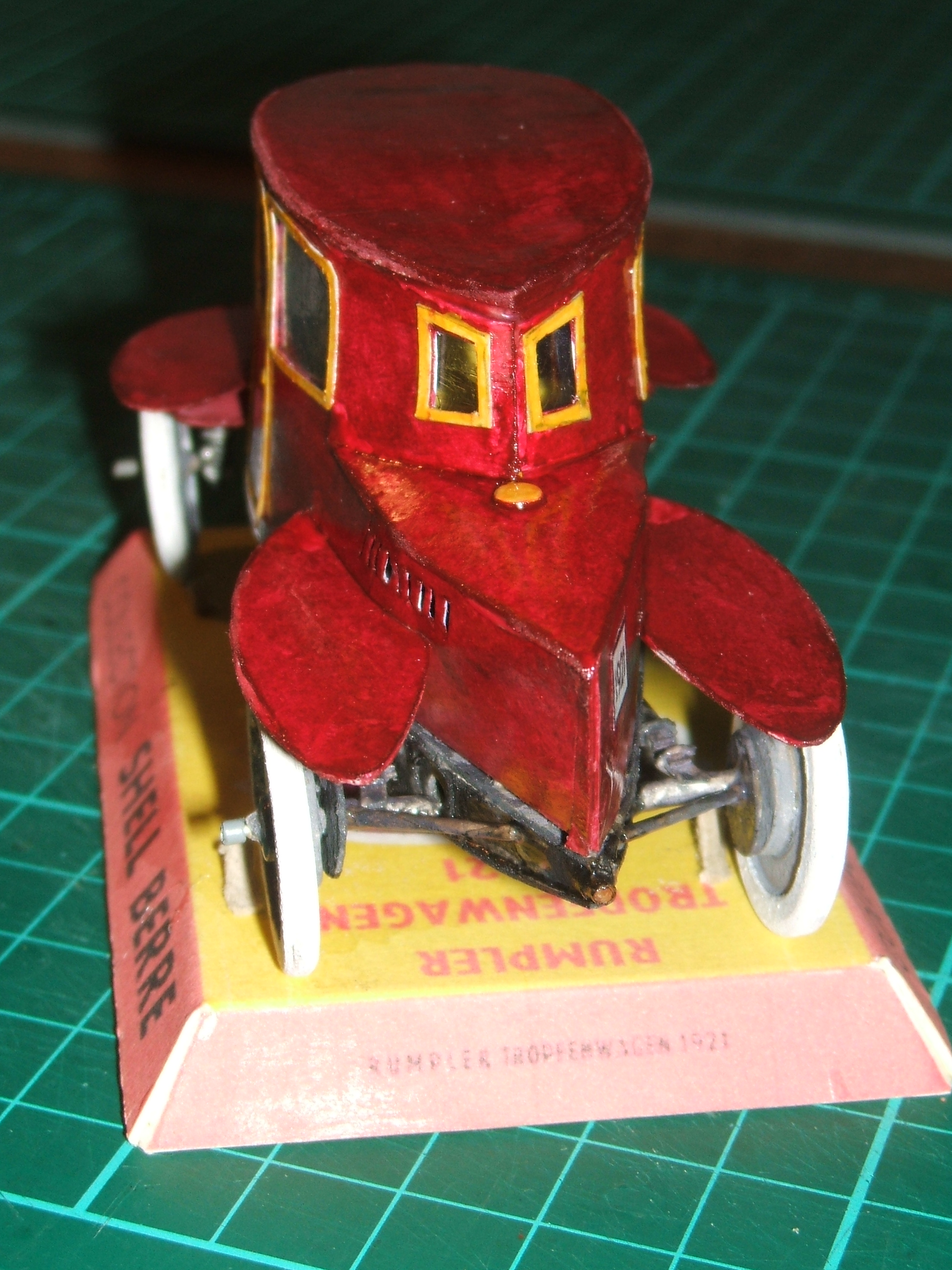 et toute seule Et c'est en faisnt les photos que je me suis rendu compte que j'avais oublié de tracer les filets et de mettre le tapis de sol rayé que j'ai retrouvé dans les morceaux de planches dépoupées. Ce sera pour une autre fois; amusez vous bien avec cet intéressant véhicule futuriste de 1921.