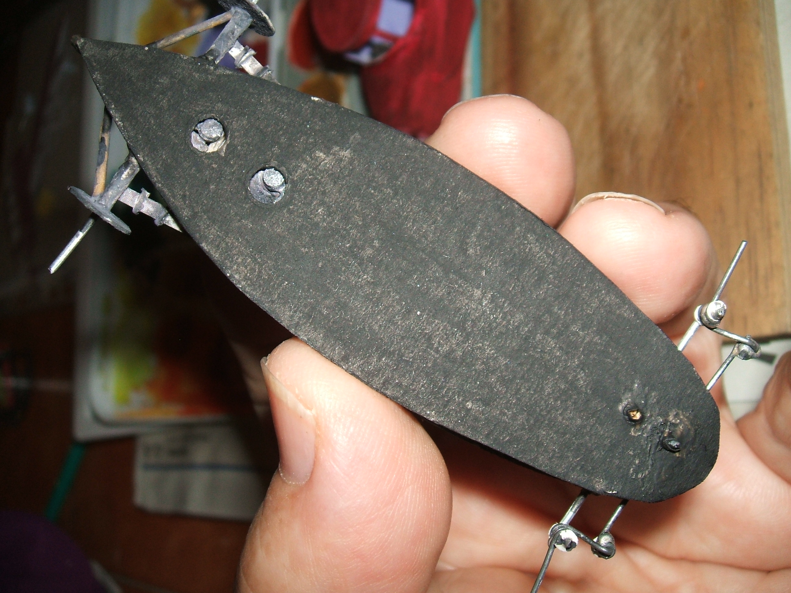 Les ailes sont faites de deux couches contrecollées, le tableau de bord est pris dans du carton épais et collé après pause des vitres.