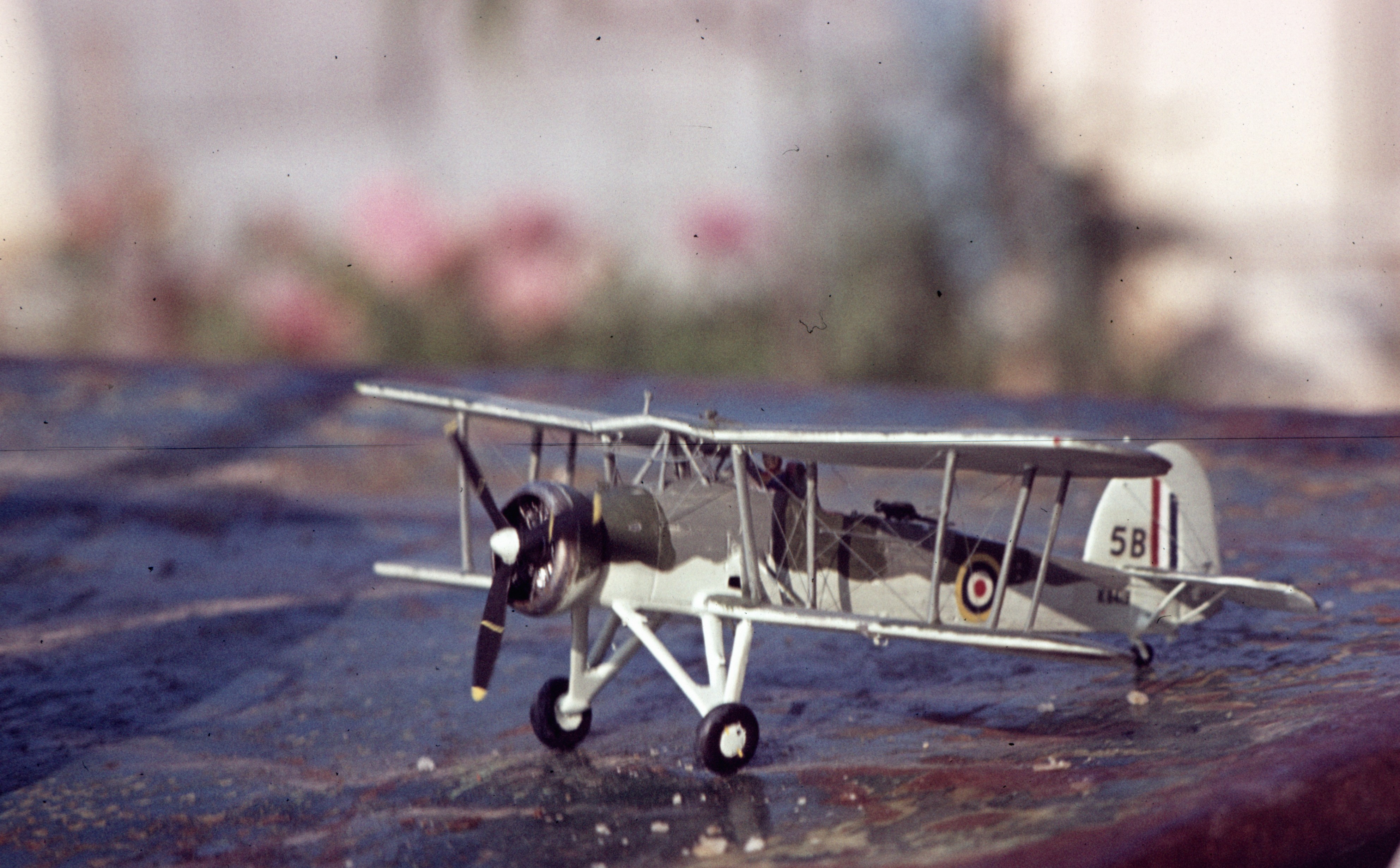 Il faut prépercer les passages de fils et essayer de ne faire qu'un seul morceau pour tous les haubans. Je ne me souviens plus quelle colle j'ai utilisé pour les bloquer. Les trous sont de 2 ou 3/10 eme de mm, je ne me souviens pas , non plus. 32 ans après, rien n'a bougé. Cette photo est un scan d'une diapo d'époque. Cet avion est celui qui était en panne lors de l'expédition sur Tarente. Sans sa torpille, il est haut sur patte et on n'a pas besoin de tout l'équipage pour faire un vol d'essai.
