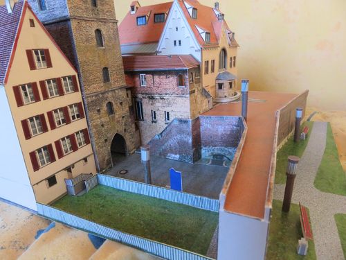 Pose des dernières toitures, lucarnes cheminées, etc...préparation du dernier niveau de la Metzgerturm, mise en place des clôtures du jardin de la maison.