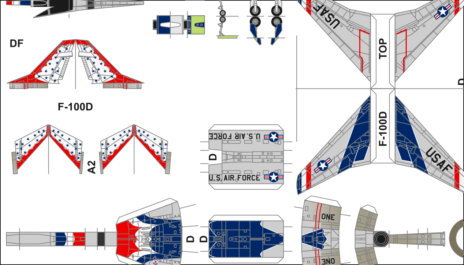 Voici un F-100C, un F-100D et un F-100F dans des couleurs portoricaines fictives, en fait les même que Cuba avec juste une inversion du rouge et du bleu (plus clair). On va dire que les Etats-Unis ont cédé 12 F-100C et 2 F-100D au début des années soixante dont les survivants ont été complétés plus tard par une dizaine de F-100D et une autre paire de F-100F.
